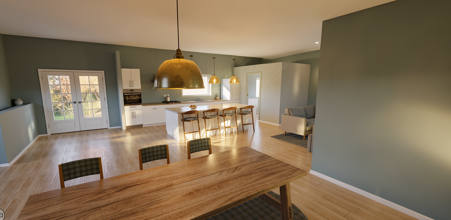 convert this floor plan into a realistic isometric 3d view of a full house show the space from an elevated angle with furniture walls and details visible modern barndominium make sure doorways are included and lots of natural light not too much windows in garage garage doors enter from right no sink in the island keep rooms and furnishings true to drawing no extra garage doors please stay true to drawing with garage doors entering from right use the same furniture as shows on the plan do not change the orientation of the floorplan