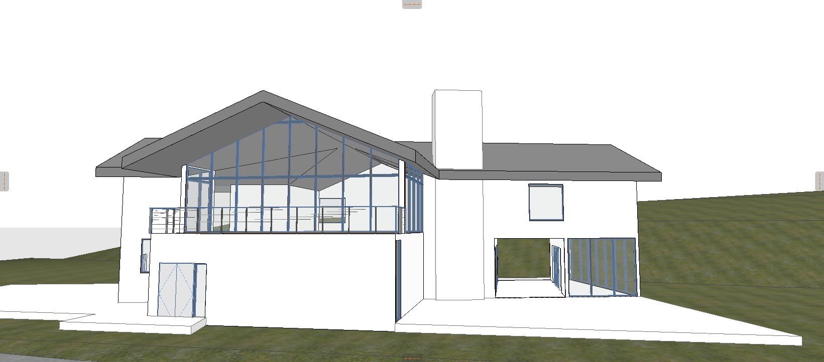 exterior shot render a photorealistic 3d perspective of this house in a truckee ca mountain contemporary style keep model geometry the same use natural wood stone and dark metal roof show sloped pine landscape granite and mountain light maintain form of the house including current windows doors pavement driveway and roof match the reference image landscape