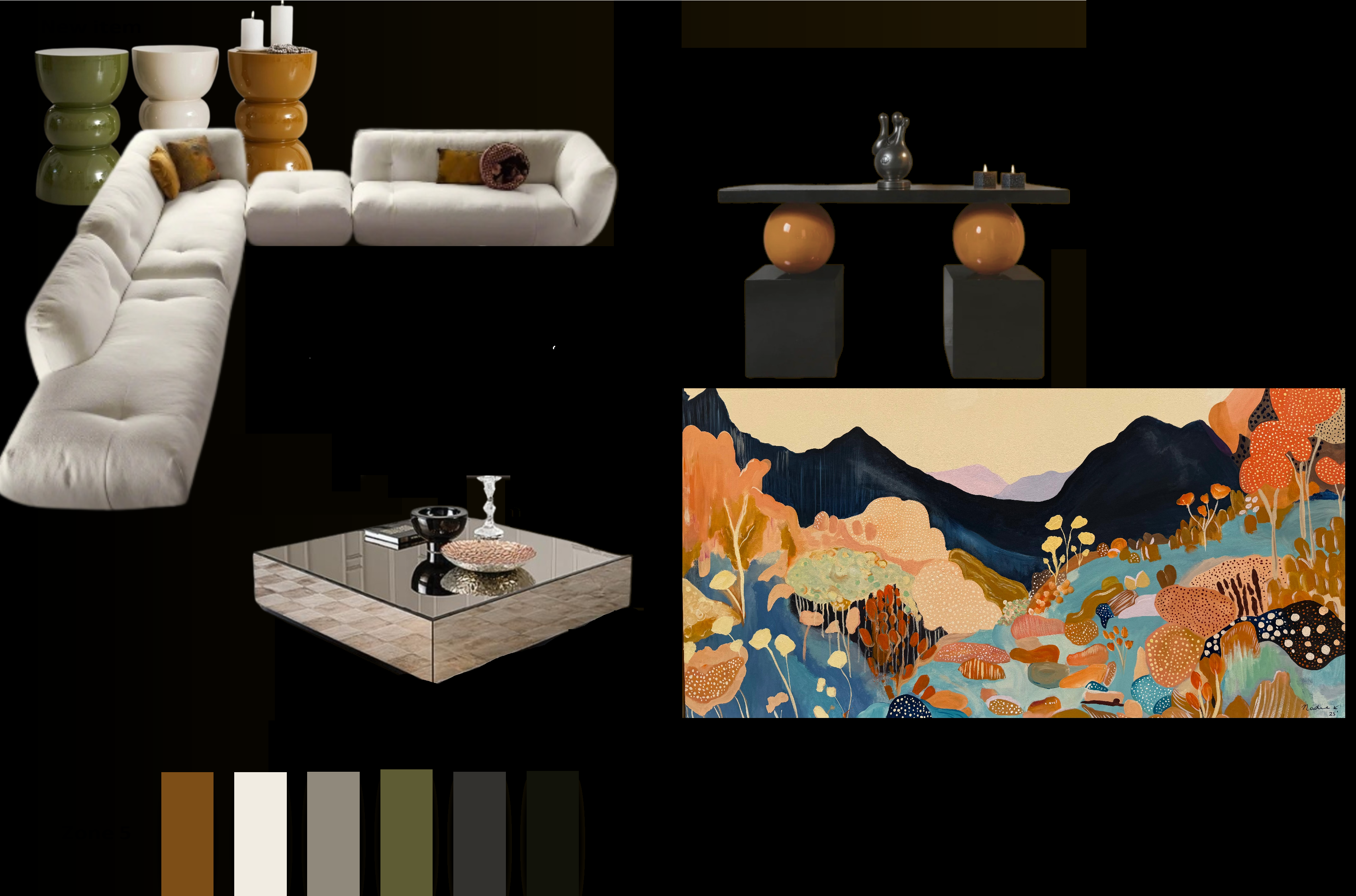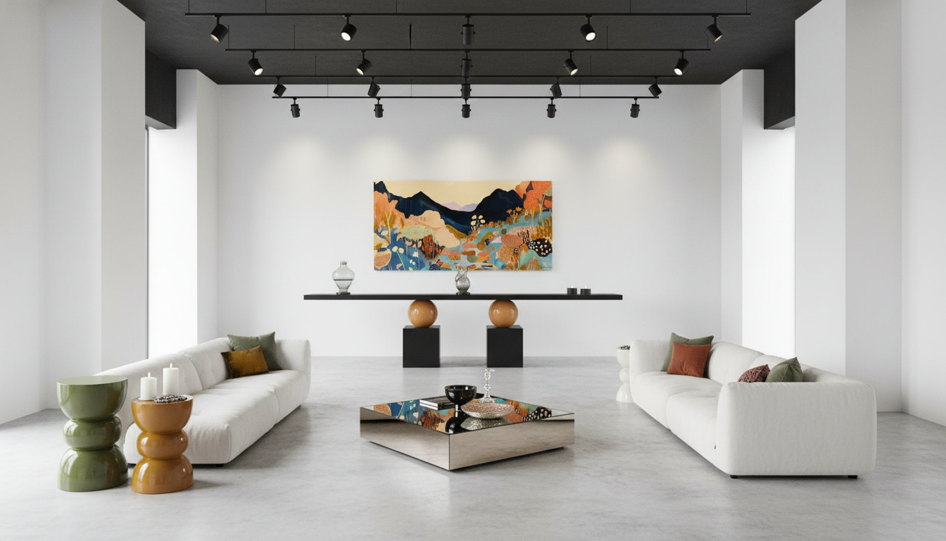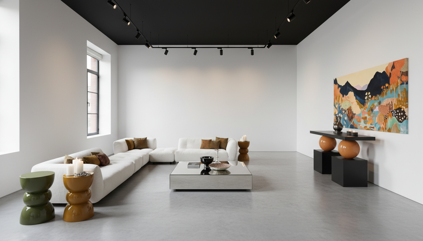 showroom concrete floor white walls black ceiling track lights double height make the side tables much smaller make the art work all the wall size remove the consol