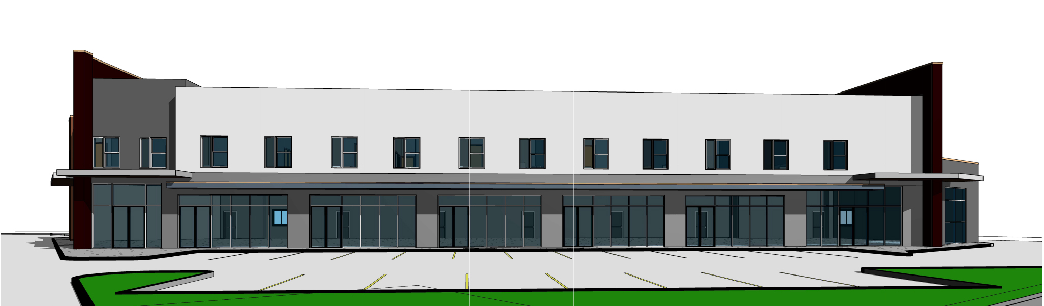 modernist exterior shot generate a photorealistic high quality rendering of this image with high reflective glass on the storefronts soft warm interior lighting soft warm exterior lighting remove all marks on the glass don t modify geometry or storefronts layout architecture