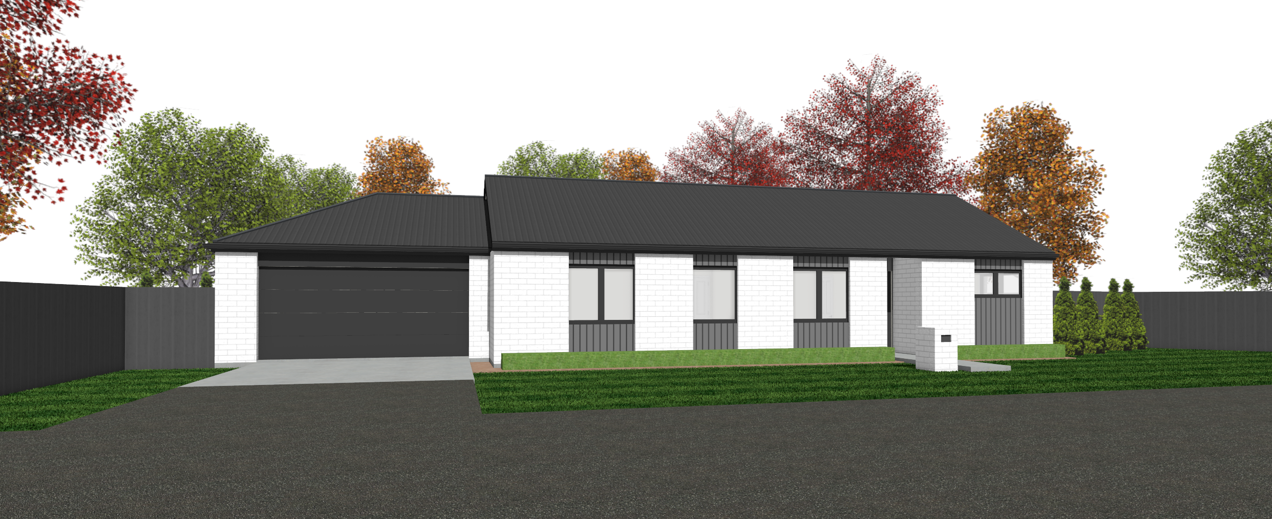 white brick black wood with a concrete driveway and fencing no grass