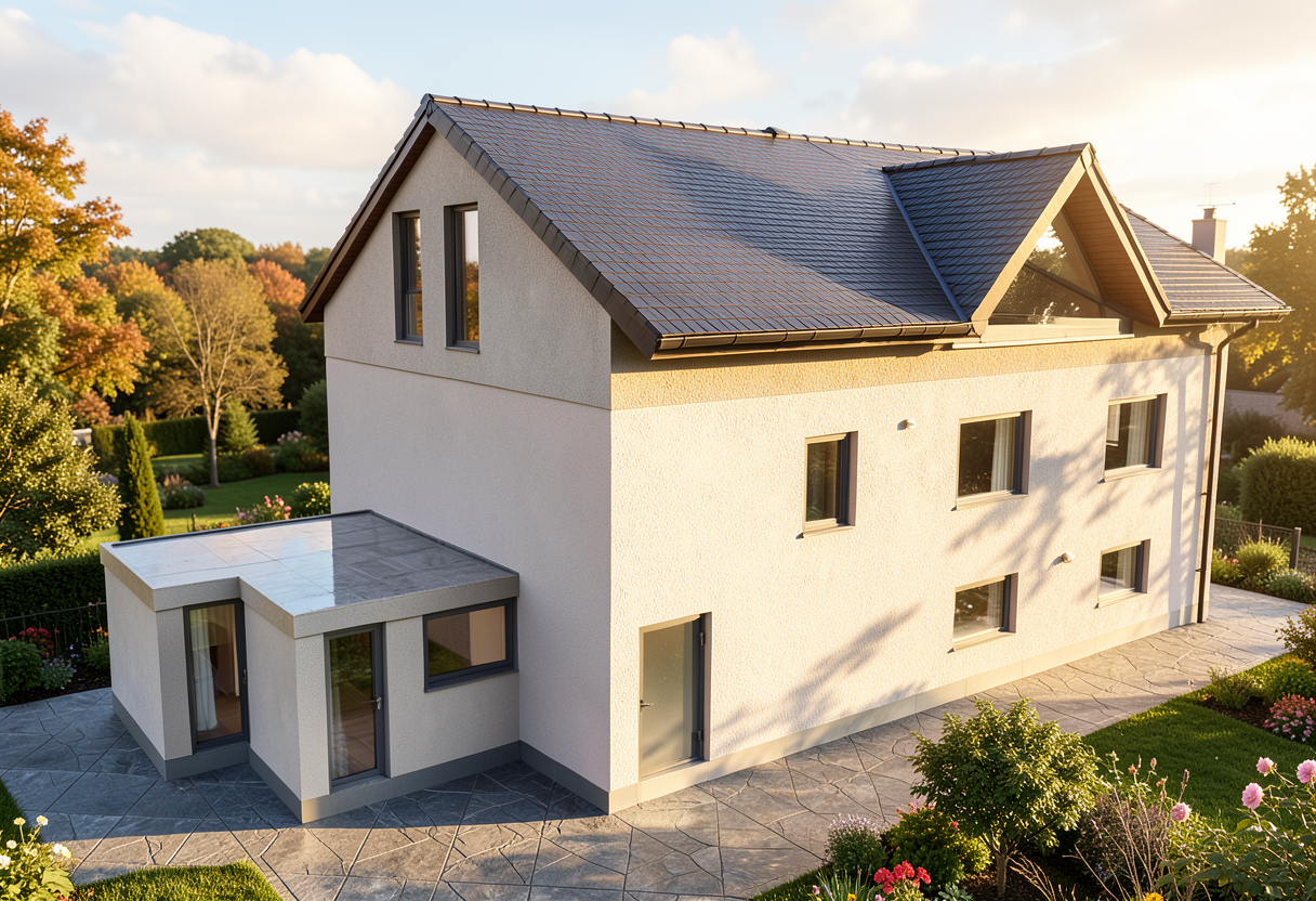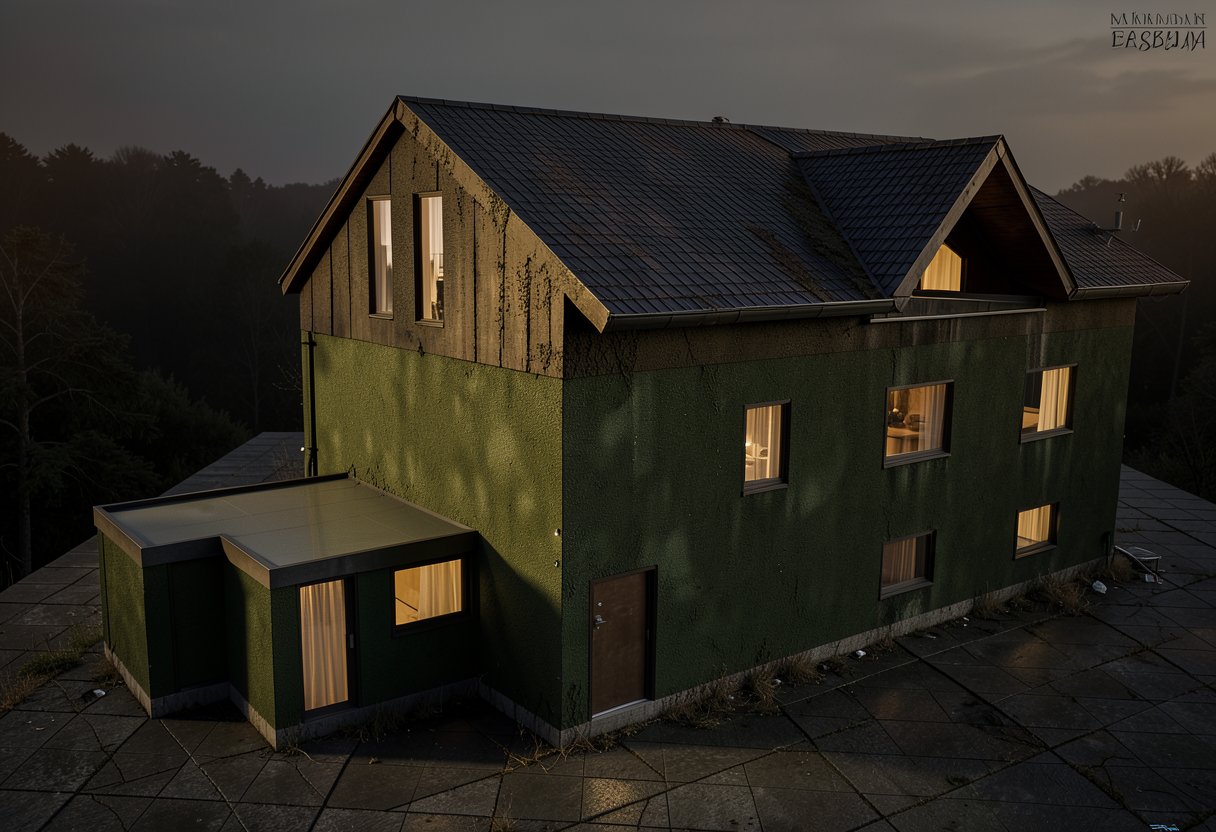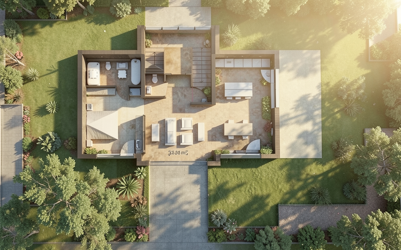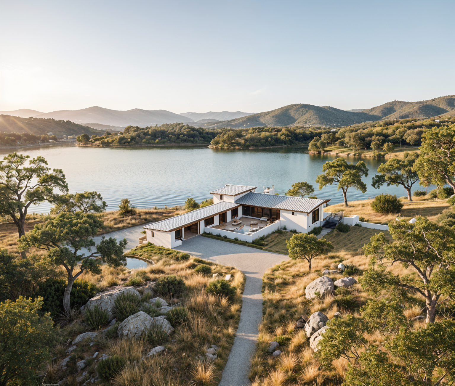 create a photorealistic architecture aerial rendering match the reference image exactly including perspective do not alter any geometry for any reason the lake should only be in the blue area at the top of the image lakehouse on inks lake texas hill country keep all site geometry and relationships identical to the reference shoreline bulkhead line house position and roof shapes green areas are a natural native texas landscape orange area is grass lawn brown area is brown gravel driveway angular gravel texture realistic compaction subtle tire patterning a small blue shape is a natural pond irregular natural edges shallow to deep gradient natural coloration the larger blue shape at the top of the image is a lake with calm blue green water with gentle wind ripples and realistic reflections visible from above red areas are limestone boulder outcroppings shoreline has a concrete bulkhead with low native grasses immediately above it retain exact bulkhead geometry and alignment retain the exact structure from the image retaining roof shapes and proportions show a light gray standing seam metal roof minimal site disturbance with native drought tolerant scattered live oaks ashe juniper dry golden grasses with occasional green pockets prickly pear accents lighting late summer afternoon sun is at the bottom left shadows cast top right physically accurate direction intensity light airy atmospheric depth hyper real architectural visualization high micro texture detail balanced hdr crisp edges crisp shadows output 8k photoreal render plan site emphasis no diagram styling not flat vector realistic materials and light