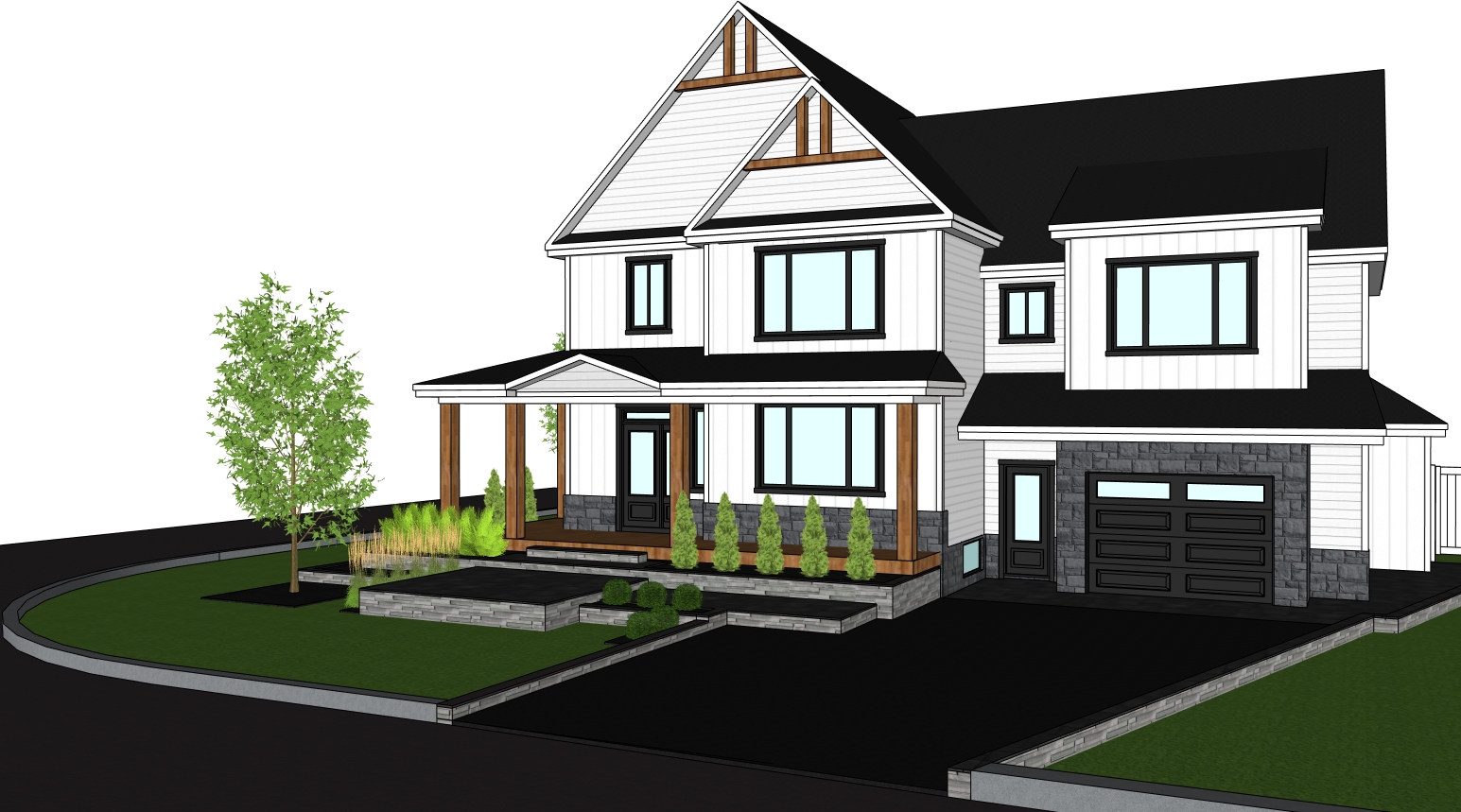 photorealistic exterior architectural rendering of a modern farmhouse style house white exterior with horizontal lap siding combined with vertical board and batten sections dark gray masonry stone veneer along the lower portion of the fa ade and around the garage door opening black asphalt shingle roof with realistic texture and clean edges the house sits on a flat well maintained green lawn with mature trees in the background the driveway in front of the garage and the surrounding road are finished in realistic asphalt showing natural texture and subtle color variation clear blue sky with the sun positioned at a low to mid angle toward the front left side of the house casting beautiful natural light across the front left corner of the fa ade enhancing textures depth and architectural details soft realistic shadows fall naturally across the lawn and driveway creating a balanced and inviting composition ultra realistic materials accurate proportions sharp details natural lighting professional architectural photography style high resolution realistic color preservation keep the color the imeage on the house