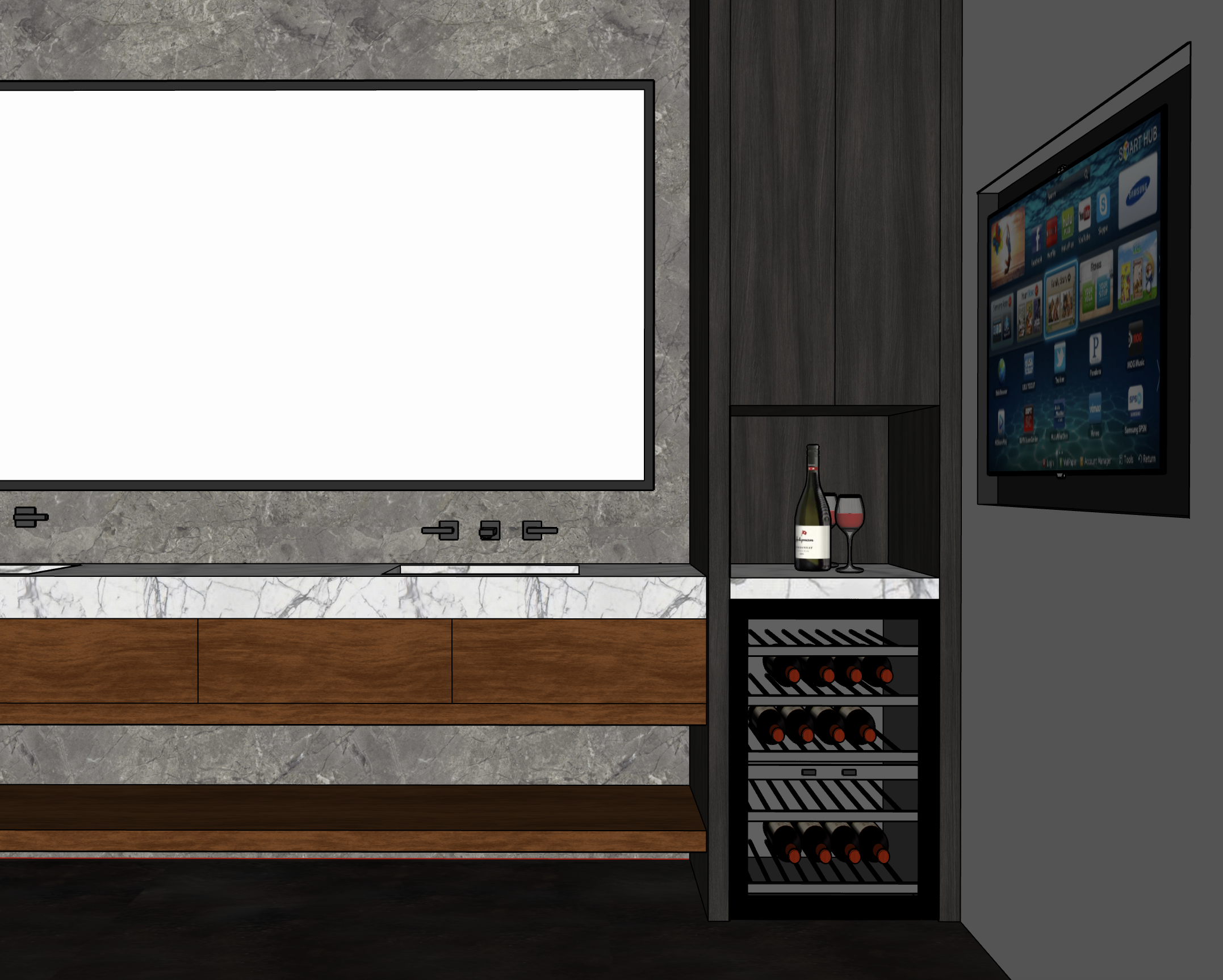 a luxury hotel room bathroom high end materials mirror with a regular reflection and led lights creating a perfect radiant glow the wine fridge under the cabinet is luxurious the cabinet with the wine is a light grey wood veneer the wall the tv is a crisp white paint the mirror reflects the white wall that is in front of it with a door