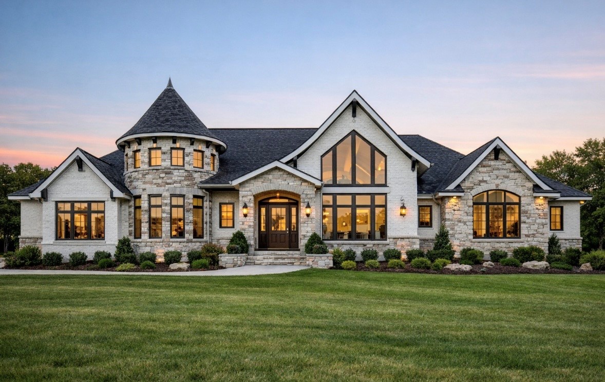 exterior shot create 3d rendering of line drawing to match the image with same materials and colors more vegetation