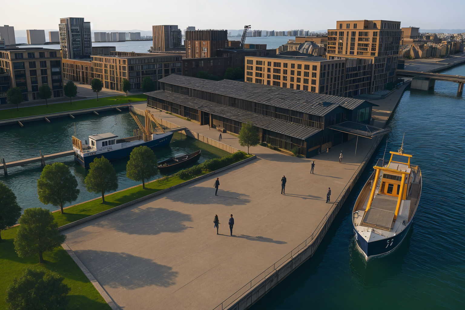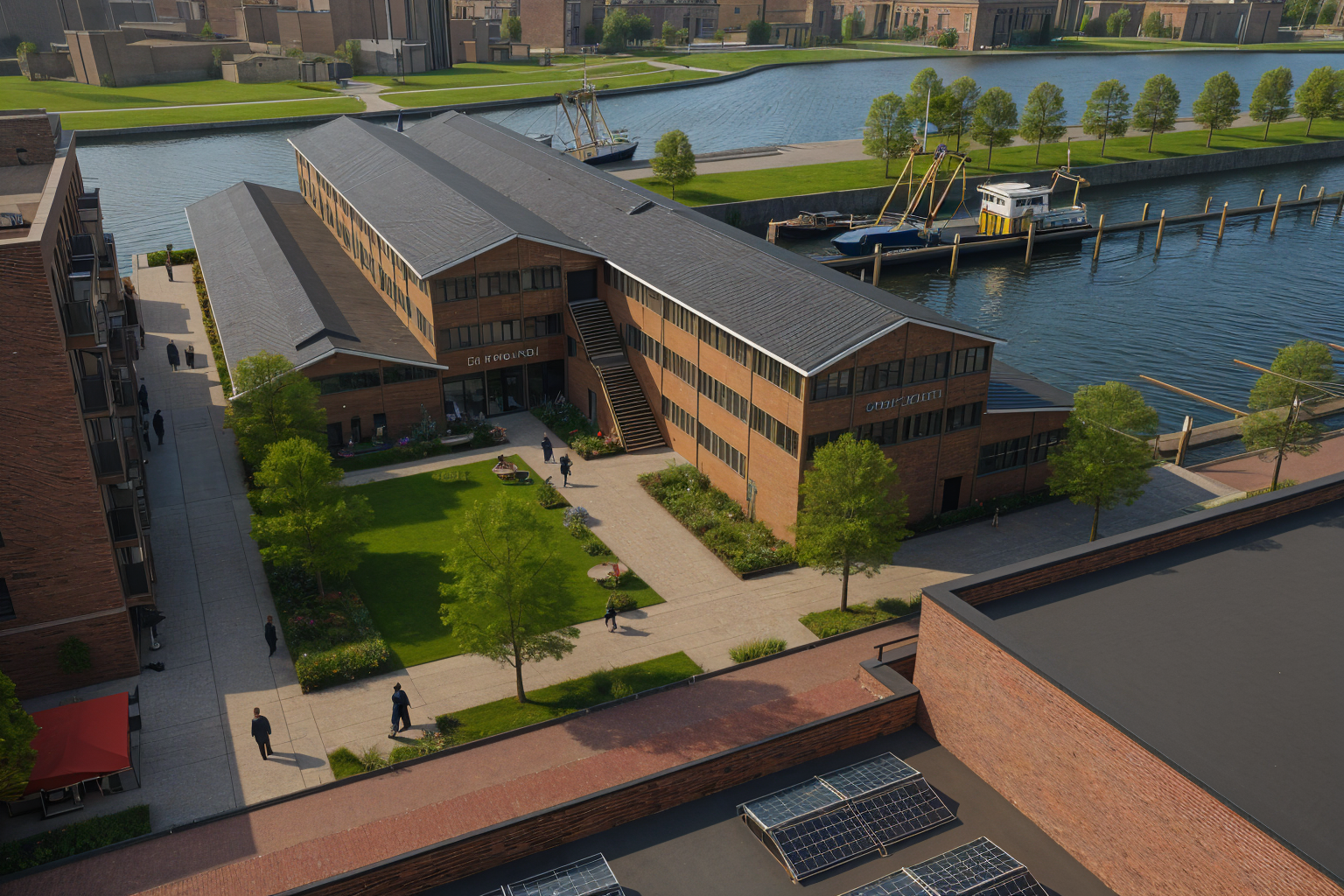 add some people in front of the building time of the day is just before sunset roof is with dutch ovh rooftiles