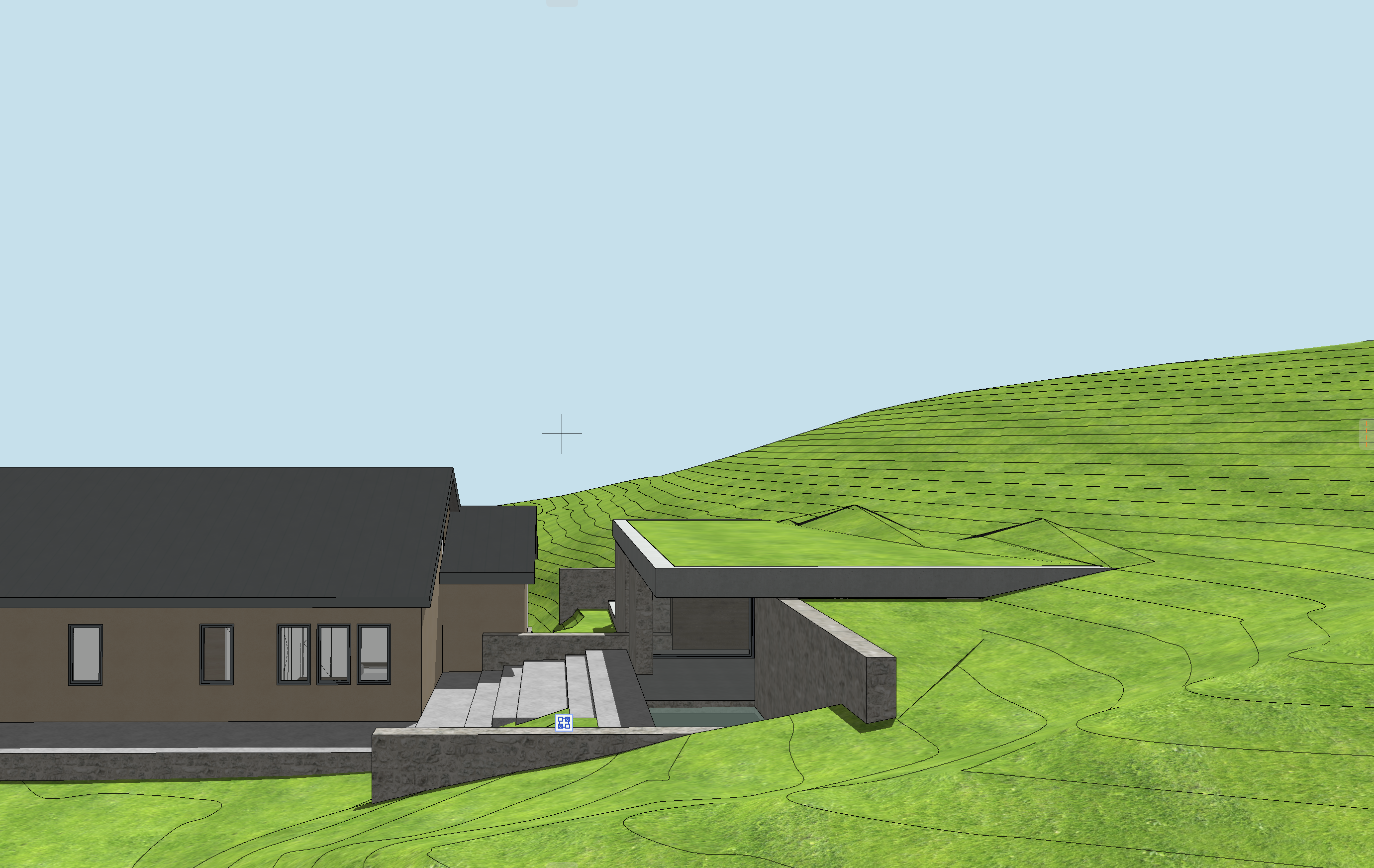 landscape hillside with sagebrush and tall wild grasses brown drystack stone walls corten standing seam metal roof on gable roof only concrete texture on fascia at flat roof keep cantilever and all geometry green roof of tall grasses and sagebrush on flat roof