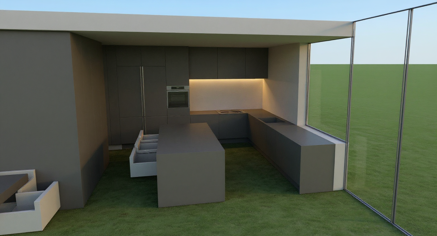 cathedral scale entertainment room bright white sculptural ceiling warm plaster architecture and mineral terrazzo floor monumental projection wall central sunken rotating circular lounge in mid century style space styled with collectible design accessories such as lacquer trays colored murano style glass chrome and brass sculptural lamps small bold accent furniture pieces in saturated tones limited but impactful color moments elegant and playful high end atmosphere wide angle architectural visualization