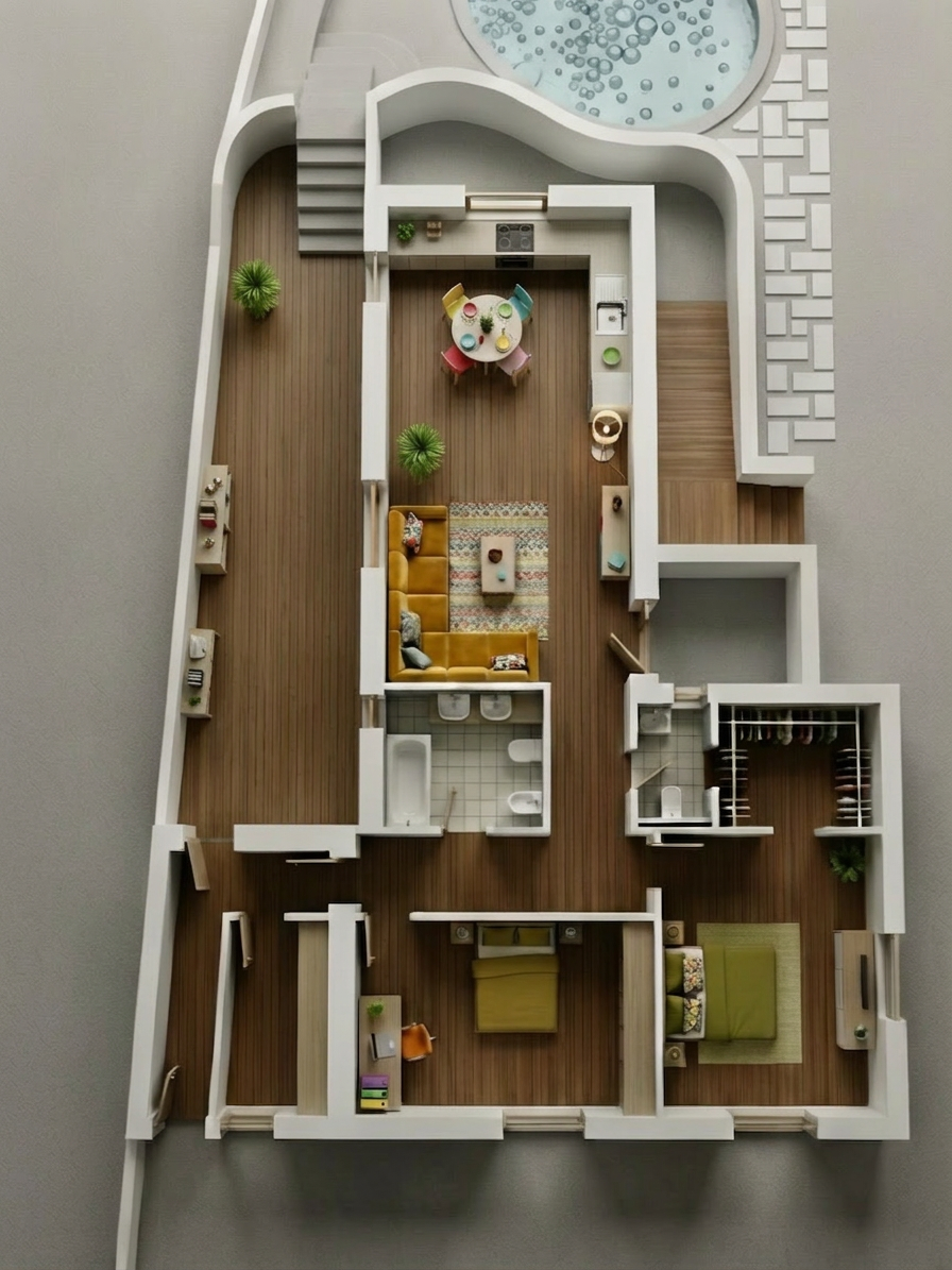 convert this floor plan into a realistic isometric 3d view of a full house show the space from an elevated angle with furniture walls and details visible add an island to the kitchen instead of the dinner table use the same furniture as shows on the plan do not change the orientation of the floorplan
