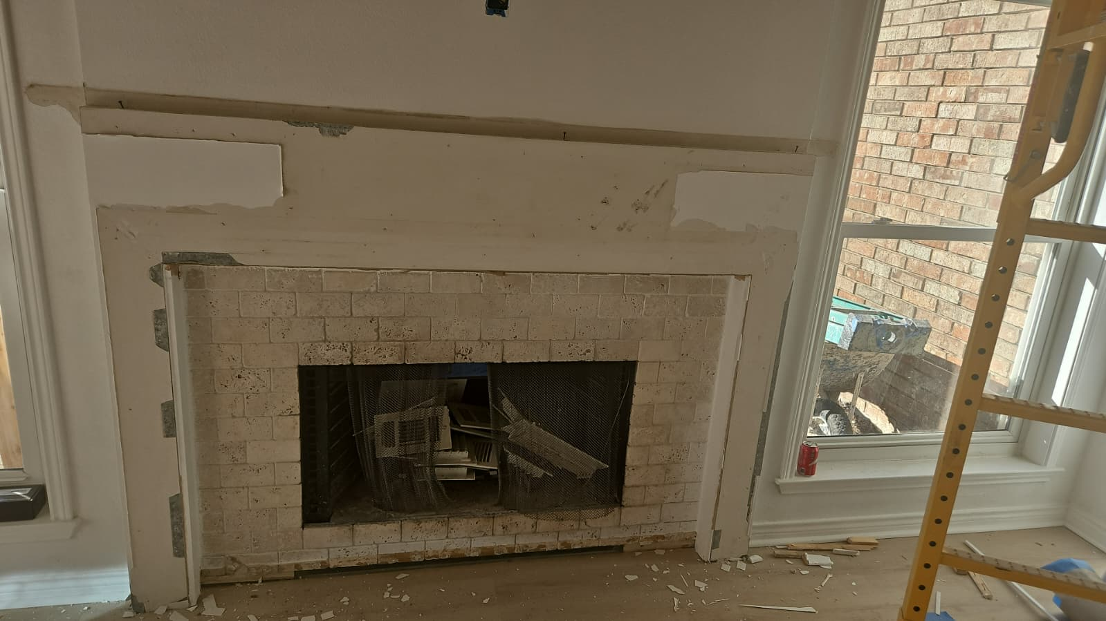 cover the bricks with white tiles and paint the rest of the wall in smooth white add a white oak wood mantel above the extrude wall