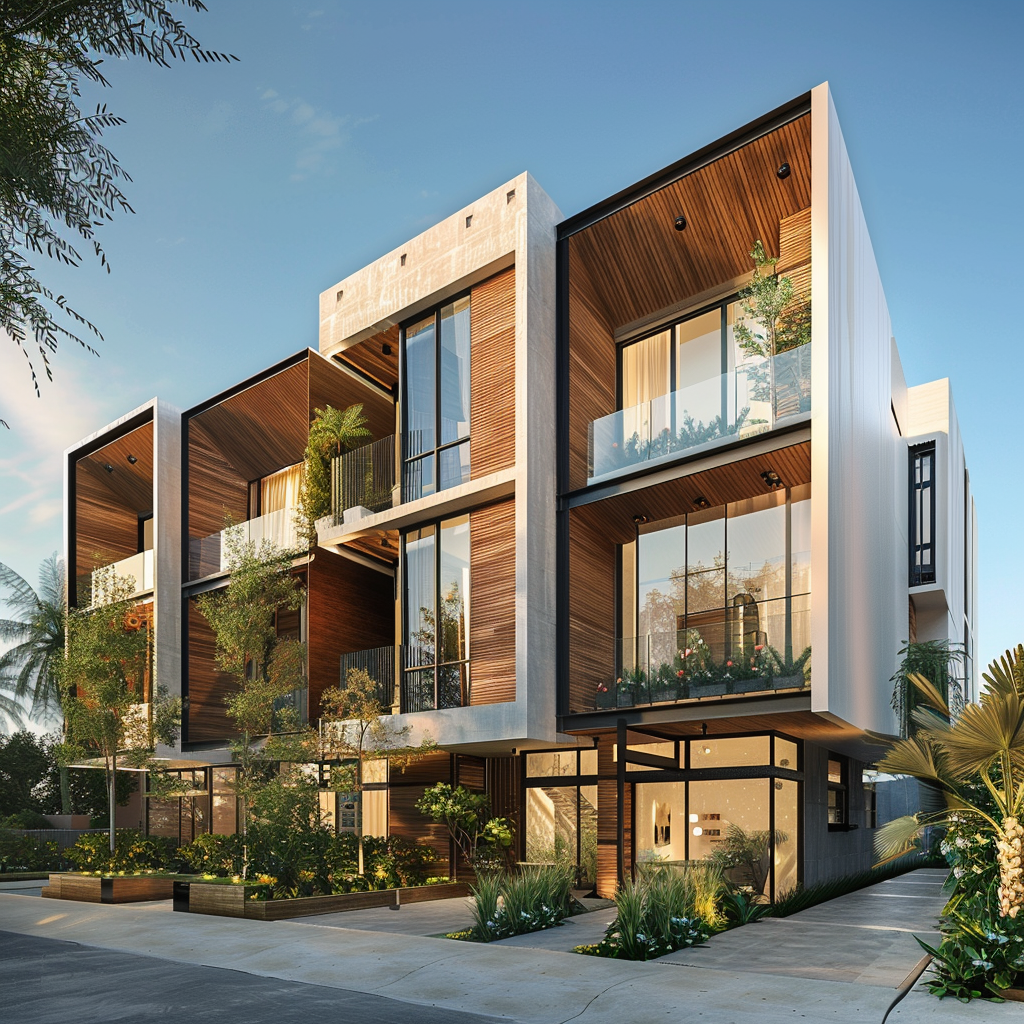 modernist exterior shot realistic architectural rendering of a miami modern mimo style mixed use building 5 stories 50 ft frontage on 4th avenue 100 ft depth ground floor parking with decorative breeze block screens 5 parking bays upper floors stepped back with private terraces white stucco facade with turquoise and pastel accents curved glass balconies horizontal lines floor to ceiling windows tropical landscaping with palm trees evening golden hour lighting cinematic wide angle view ultra realistic materials photorealistic shadows and reflections v 6 ar 16 9 q 2 style raw architecture