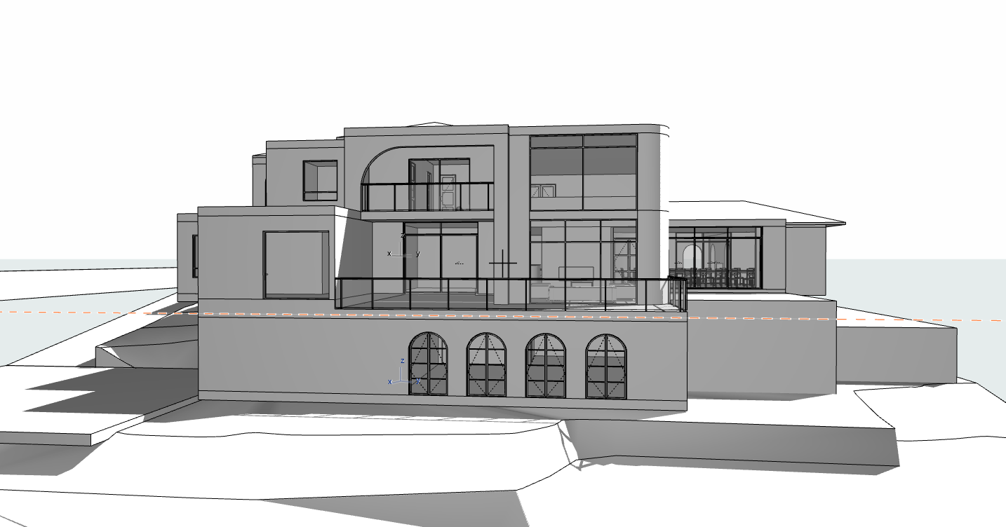 exterior shot keeping the exact design and proportions from the original style the building in a modern mediterranean look with white plaster walls black joinery glass balustrades with a simple single steel handrail and balusters include a grass bank in the foreground render the final image as a coloured pencil sketch with soft textures and hand drawn qualities