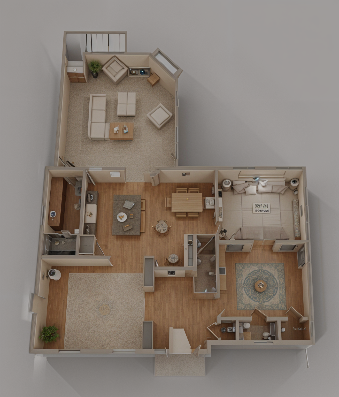 this is an architectural drawing of a floorplan note the locations of the sink in the island the appliances the dining table and french doors to the deck what would this look like as a classic boho style 3d render
