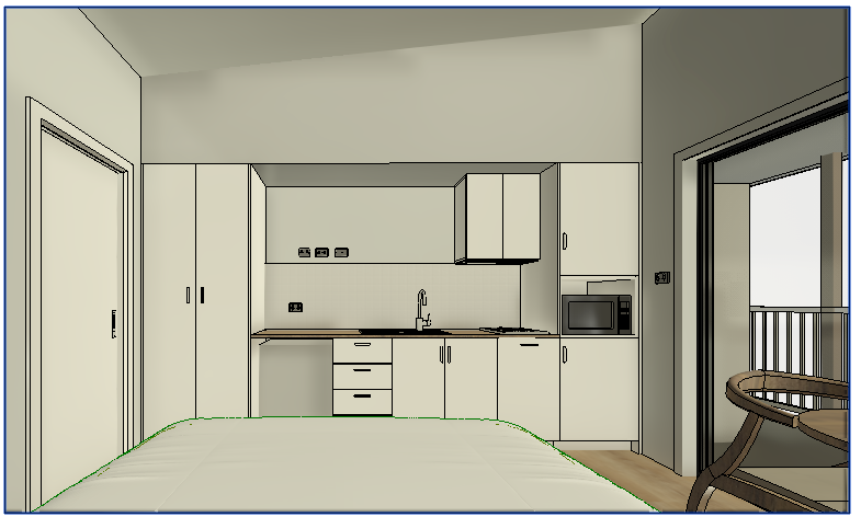 add bar fridge next to robe where space in below bench and tv above on wall next to robe
