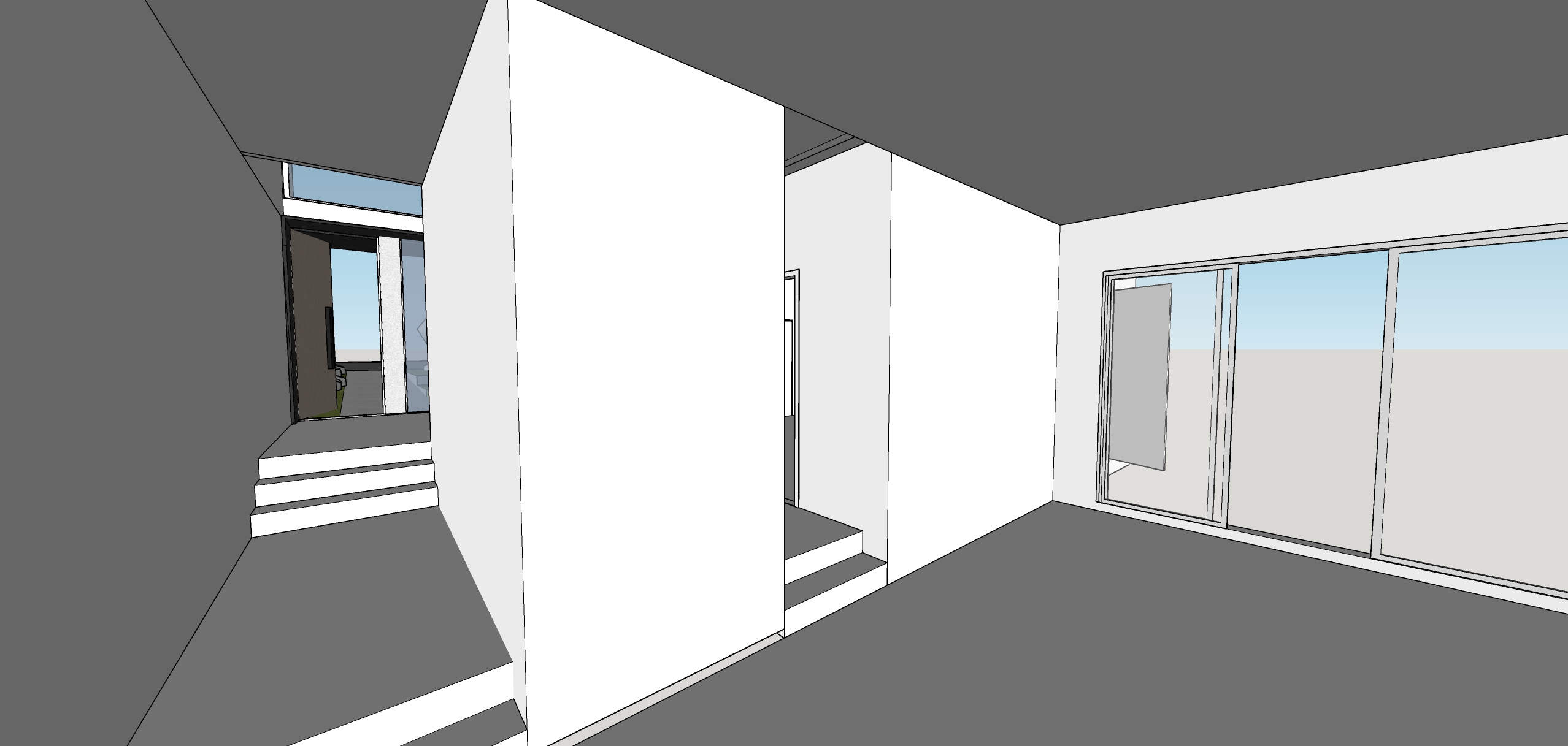 interior viewing from a seating space in the right and also to left is the corridor looking into a double volume spatial entrance featuring large glazing using a light feature addressing the welcoming atmosphere