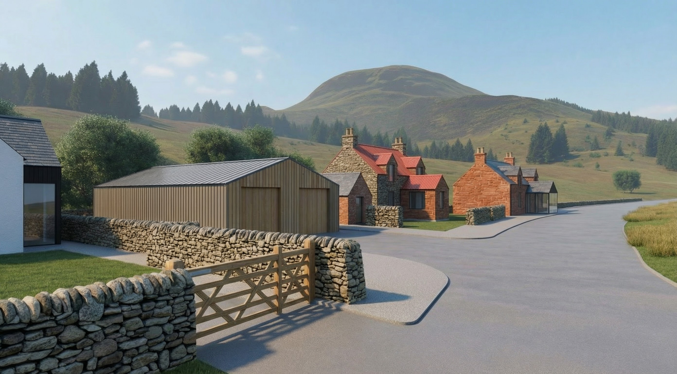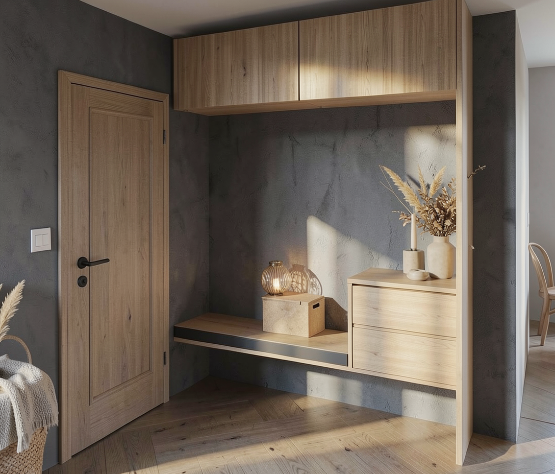 prompt a modern minimalist house in a scandinavian architectural style the house features a sleek metallic roof with a subtle gray tone complementing the light wood siding painted in soft natural beige large windows adorn the front reflecting the serene blue sky a sleek dark gray metal railing runs along the upper balcony the setting is a calm tranquil neighborhood with lush greenery surrounding the house the atmosphere is peaceful with a gentle warm sunlight bathing the scene casting soft shadows the overall aesthetic is clean inviting and harmonious with nature