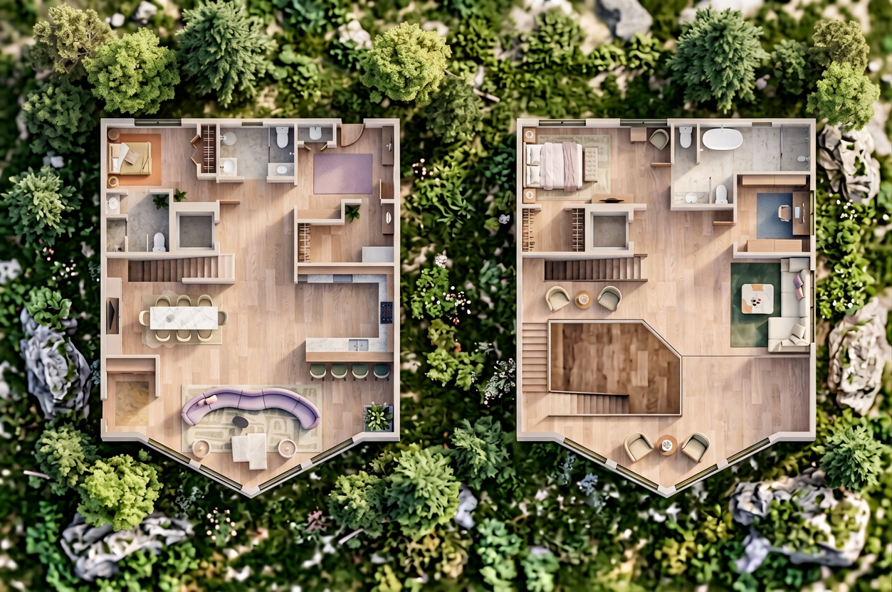 futurism exterior shot render a charming house with a welcoming atmosphere the house features smartly designed color and material blocking using light brick dark blue hardie exterior paneling and wood panel accents large windows with dark gray roof warm wooden door the surrounding landscape includes lush green grass vibrant flower beds in shades of lavender pink and yellow and tall green trees that frame the property the sky is a clear blue with a soft golden glow from a setting sun casting gentle shadows on the house overall the scene should feel serene and inviting architecture