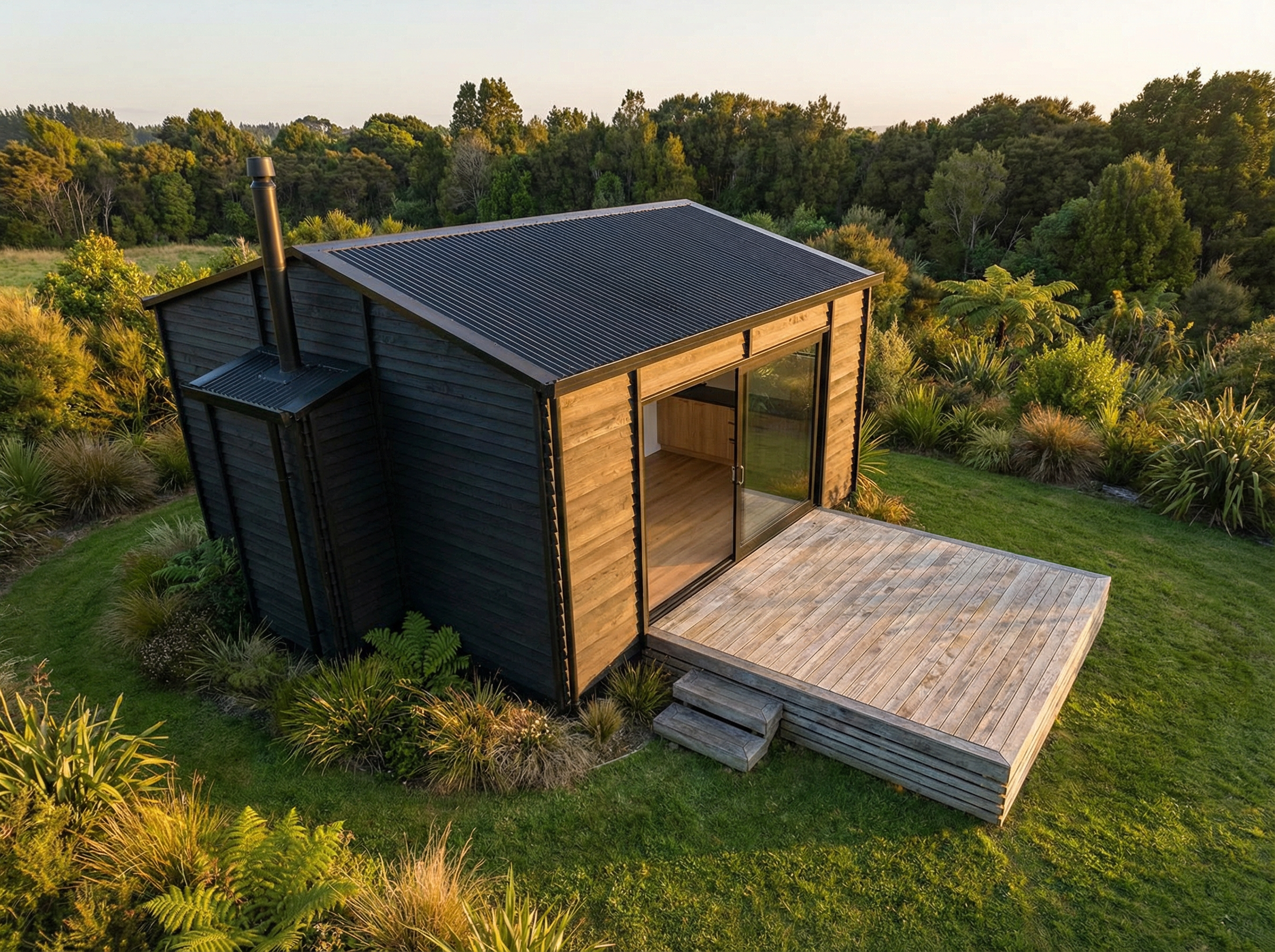 black board and batten cladding black roof black window frames polished concrete interior floor lawn low timber deck extensive native planting background trees sunset