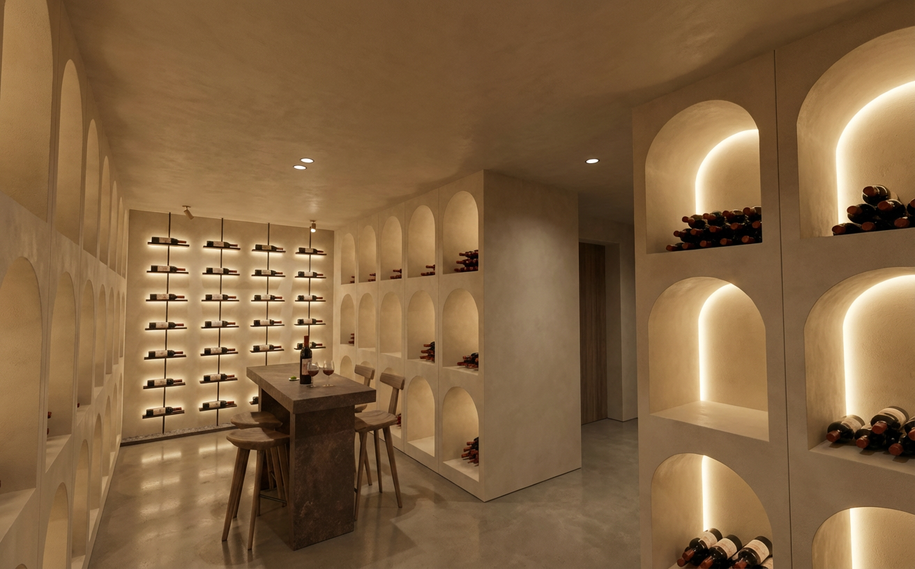 transform the provided wine cellar image into a high end photorealistic architectural render while strictly preserving the original volume layout proportions straight ceiling arches and spatial configuration do not modify any geometry or positions all walls and ceiling should be finished in a soft beige lime plaster with subtle mineral texture and a matte handcrafted appearance the floor remains in beige grey polished concrete with soft reflections at the back wall apply a uniform wall backlighting indirect led that softly washes the entire surface from behind or below emphasizing the architectural plane do not individually light the bottles the lighting must highlight the wall as a whole not create point lighting on each bottle inside the niches keep a subtle and homogeneous ambient glow avoiding strong or direct lighting on the bottles the effect should remain soft diffused and architectural ensure chair consistency use the same wooden chair design on both sides of the table replicate the wooden chairs from the left side and apply them identically to the right side maintaining symmetry and coherence slightly increase the overall brightness of the scene the lighting should feel warmer softer and more luminous while preserving a calm atmospheric mood avoid overly dark or contrast heavy rendering keep all materials highly realistic lime plaster texture natural wood grain stone table surface glass reflections and subtle floor reflections the final render should feel like a refined minimalist high end architectural visualization with balanced soft and slightly brighter lighting