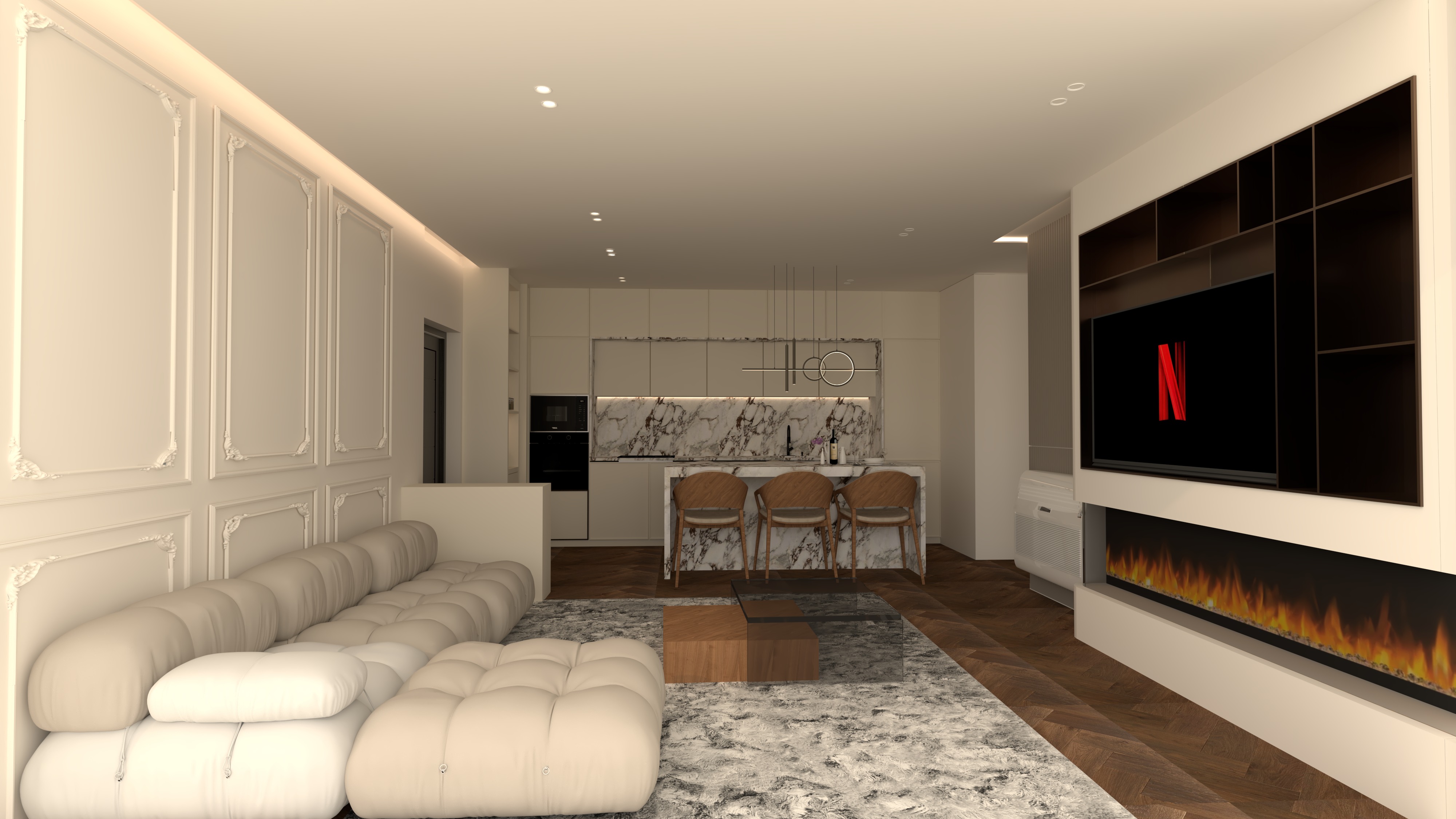 warm minimalist bedroom interior classic european apartment high ceilings with decorative plaster ceiling rose and crown molding soft beige and taupe color palette upholstered bed with neutral linen bedding textured wool rug light oak parquet floor black metal bench at foot of bed with upholstered cushion wooden bedside tables small sculptural bedside lamps sheer floor length curtains soft natural daylight calm and elegant atmosphere scandinavian parisian style realistic materials subtle shadows balanced composition architectural interior photography ultra realistic high detail soft contrast 35mm lens f 4 global illumination photorealistic render 4k negative prompt opsional clutter bright colors harsh lighting glossy materials oversaturated modern led strips low resolution distortion