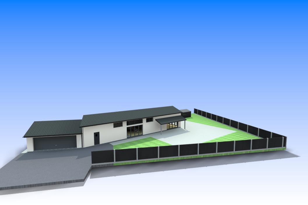 add two cars in front of the garage add some small trees near to the fence a mix of native spieces add some very small shrub planting near the house but keep the paths and patio area exactly to the dimetions they are