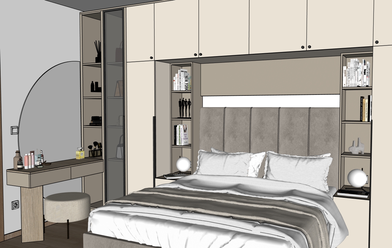 under the make up table is spherical mirror make photo realistic natural light come from left side fronts of wardrobe are brighter