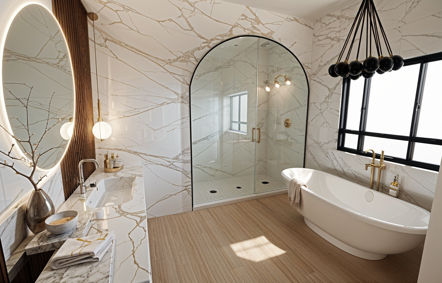 photorealistic soft modern primary bathroom architectural digest editorial interior photography clean architectural composition eye level 35mm lens full height calacatta marble slab walls with soft natural gray veining bookmatched subtly arched walk in shower enclosure with ultra slim matte black metal framing and low iron glass barely visible seams linear drain dual ceiling mounted rain shower heads realistic water spotting and faint glass reflections integrated marble slab vanity with mitered edges and waterfall sides fluted dark walnut vertical panel feature wall behind minimal matte white sculptural faucet no mirror freestanding matte white oval soaking tub with thin edge profile positioned near black steel grid window brushed brass floor mounted tub filler with hand shower statement glass milk chandelier above the tub clustered milky white globes suspended at varying heights warm diffused glow soft shadow play on marble light natural european oak flooring in wide planks subtle grain texture minimal styling folded ivory linen towels small travertine tray single ceramic vessel with bath salts one organic branch in clay vase very restrained curated no clutter lighting soft natural morning light entering from window gentle directional shadows warm 2700k ambient glow from chandelier balanced exposure true to life material tones no over sharpening no hdr look high dynamic range realism accurate material scale subtle imperfections soft depth of field falloff natural color grading cinematic but understated luxury spa atmosphere