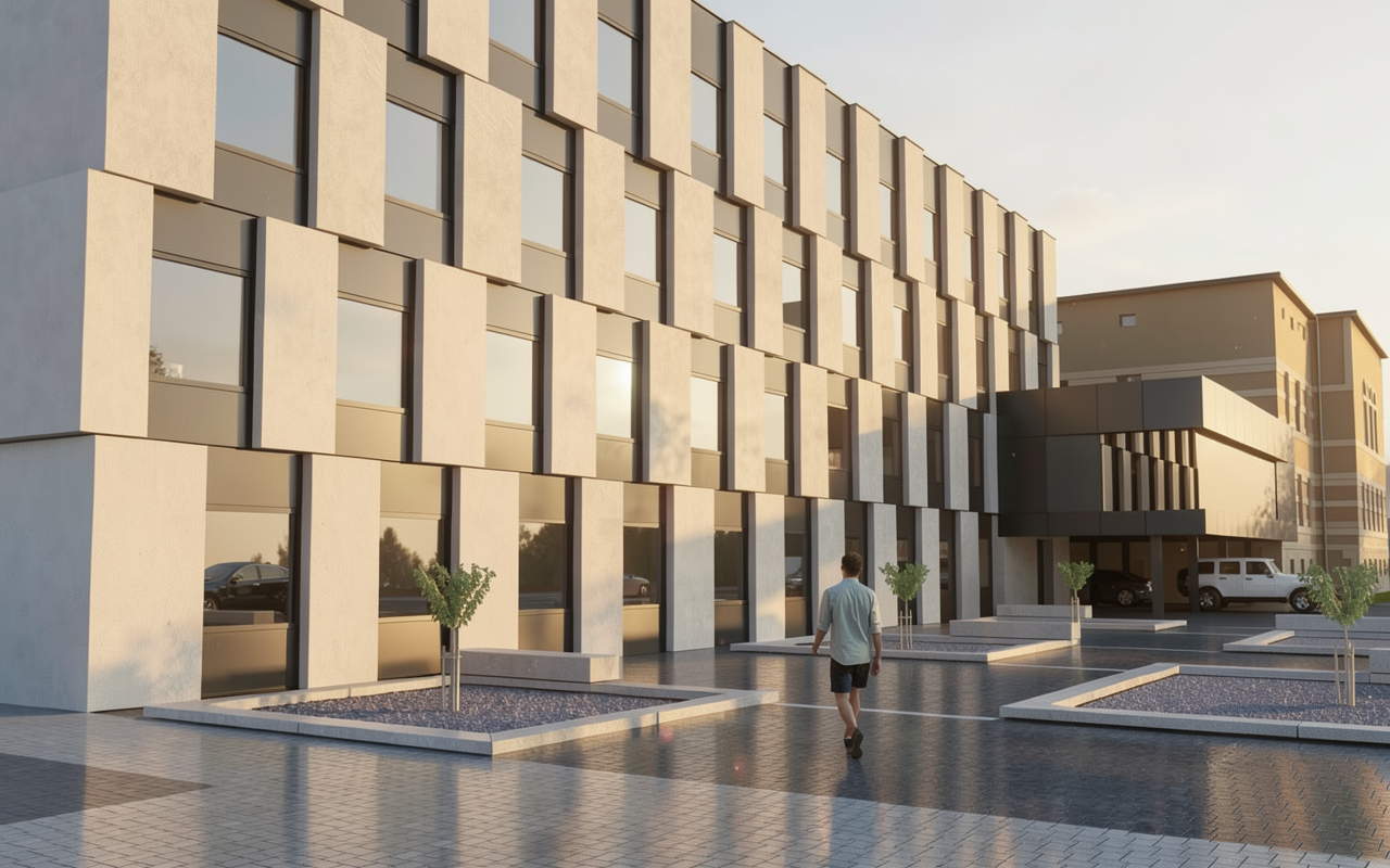 the appartment is on the 6th floor in a parisian building the walls are in very light greige the floor is in black wood the sofa is in greyish terracotta corduroy the ceiling is in the same color as the walls the espagnolette bolt is in dark bronze add some ancient books on the shelves the tabvle is in travertine the frame of the window is the same color as the walls