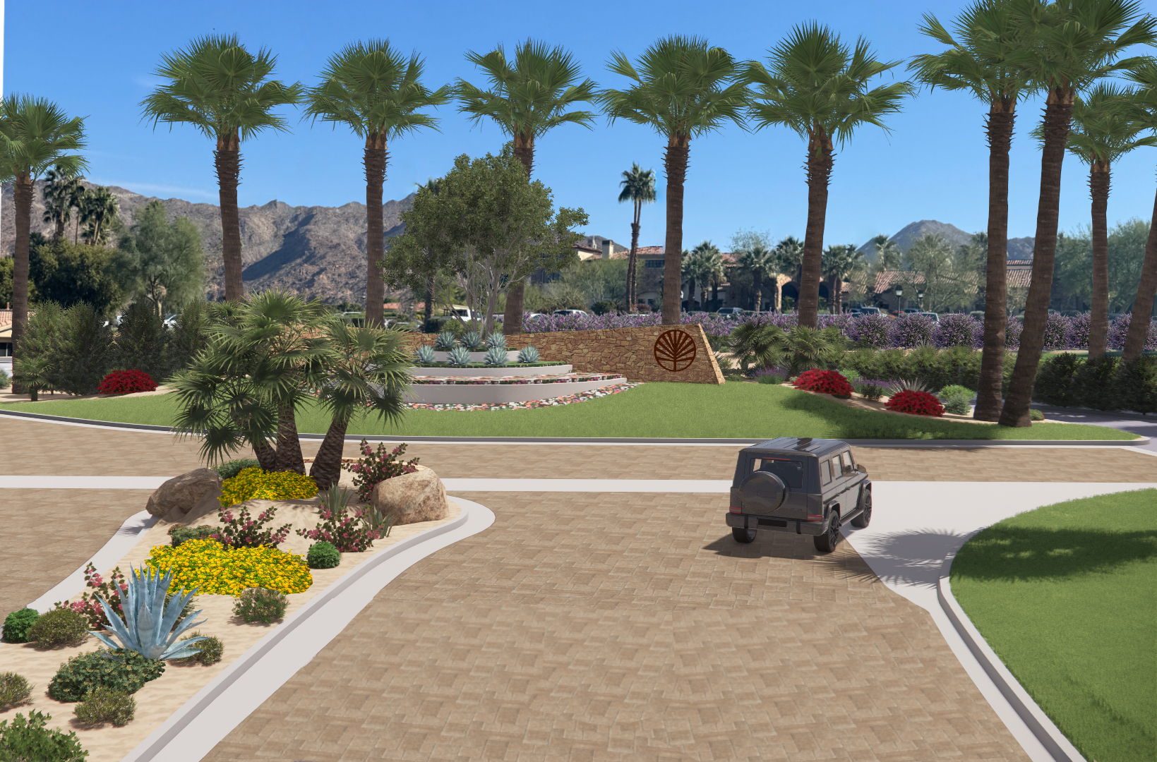 photo real rendering with pavers in the street stone clad monument walls the tree shown in the center is a desert ironwood tree at the center of the monument the terraced planters are filled with carissa green carpet on the top two and annual color in the bottom two levels and lawn in front mediterranean fan palm at the ends of the wall and in the median