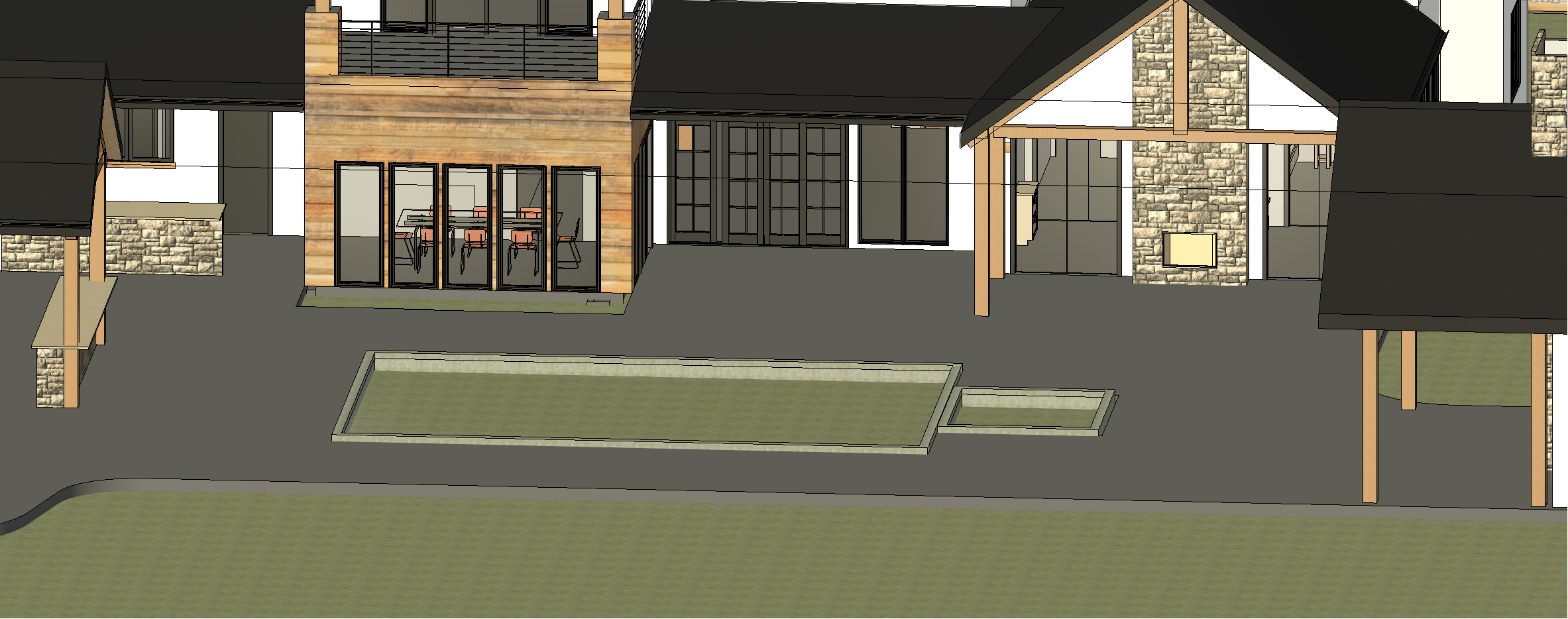 a beautiful detailed rendering of a luxurious modern mansion with a large black roof and white walls highlight the stone chimneys in shades of light tan and gray for a natural look use warm light wood tones for the exterior wood paneling and structural accents design a vibrant lush garden in the foreground with rich green grass and realistic foliage add a crystal clear turquoise swimming pool for a refreshing contrast capture a serene and sunny afternoon atmosphere with soft natural sunlight casting gentle shadows