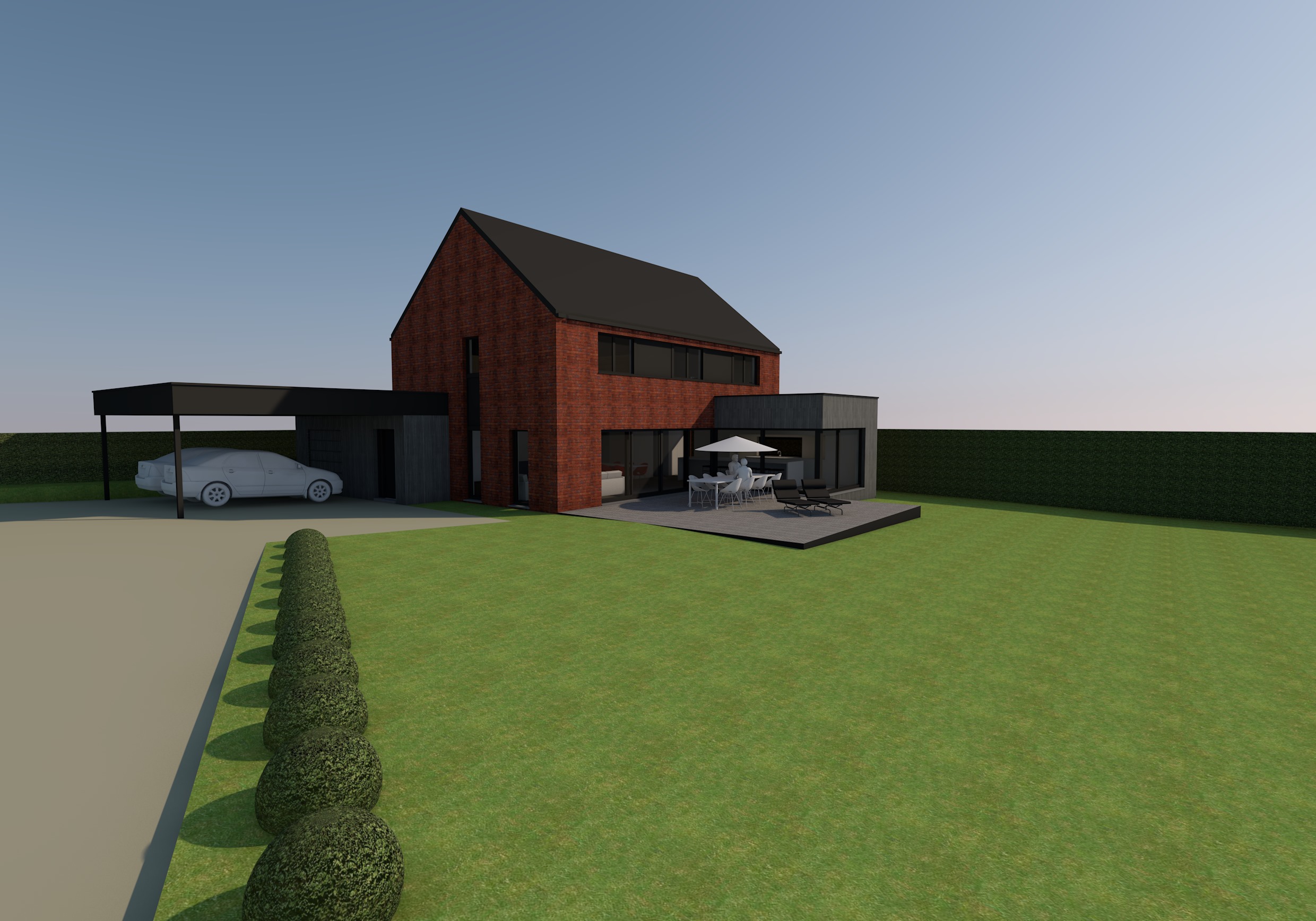 exterior shot rendu d une maison moderne en brique entourez la maison d une pelouse verdoyante et de haies bien taill es cr ez une atmosph re sereine et accueillante sous un ciel bleu clair gr ce la lumi re du jour
