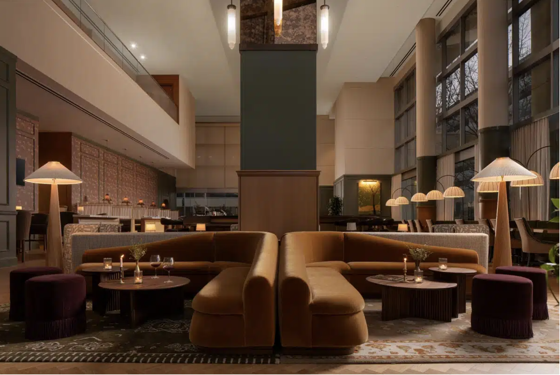 give this room a converted soho loft feel with a raw ceiling and white beams this is a night time image and a sultry warm lit cocktail lounge in nyc do not change the structure scale furniture lightfixtures or floorplan of the original input image look to the reference image for mood and lighting