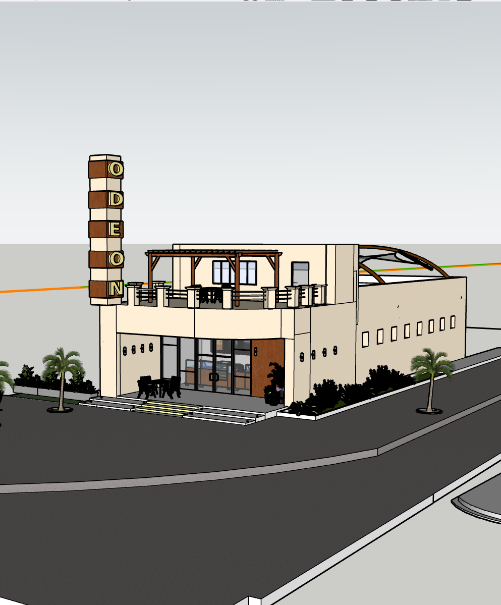 use the uploaded real photo of the odeon outdoor cinema in downtown djibouti as the base image redesign the building while preserving its original structure silhouette and central vertical column to maintain its identity and cultural presence the redesign should feel like a contemporary revival polished minimalist and regionally grounded in line with asta studio s aesthetic key design features materials refresh the fa ade using white mineral plaster or smooth tadelakt with subtle texture and soft sheen add brushed brass or bronze accents to windows and door frames for a touch of understated luxury use light colored stone paving at the entrance and sidewalk zone signage keep the iconic vertical odeon column sign but modernize it as a clean led lit installation with slim backlit sans serif letters glowing vertically the lighting should be elegant and visible even during daylight grand entrance design a welcoming entry with a recessed canopy or pergola made of warm toned wood or perforated metal for filtered shade generous sculptural planters with drought resistant plants like palms ficus or aloe built in bench seating and small caf style tables to encourage interaction street activation the street in front should feel lively and animated with pedestrians walking or sitting a few cyclists or tuk tuks parked nearby locally inspired paving patterns or integrated sidewalk lighting rooftop access add a usable rooftop terrace framed with minimalist metal or glass railings the rooftop includes modular seating planters and maybe a shaded pergola ideal for small public gatherings or open air screenings ambient lighting even in daytime early afternoon light subtle architectural ambient lighting should be integrated under ledges planters signage and thresholds hinting at the building s elegant evening atmosphere architectural style the overall design merges modern mediterranean forms with djibouti s climate and urban texture use clean lines arched or shaded thresholds rhythmic openings and layered depth to create a cinematic and timeless visual the final image should feel realistic elegant and revitalized maintaining the nostalgic identity of odeon while elevating it into a modern urban cultural hub