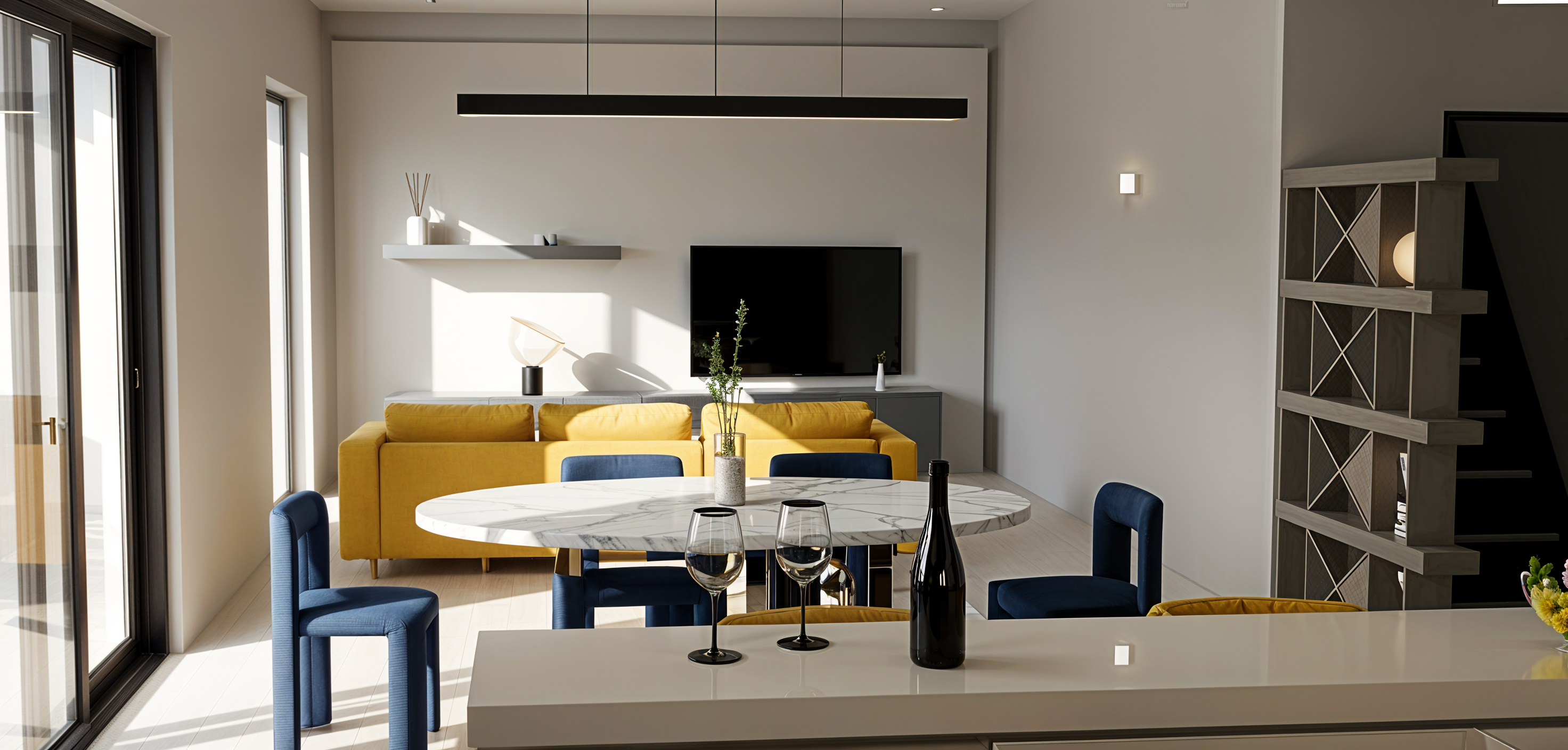 modern open plan living and dining area minimalist interior design neutral color palette with shades of gray and white oval dining table with calacatta marble top and triangular legs in reflective mirror material fabric chairs with blue fabric frame amia model by miniforms beige fabric sofa with yellow cushions beige low cabinet with glossy lacquered finish and glass legs dark beige shelf taccia model lamp by flos with black base and transparent and white lampshade fixtures with light gray profile decorative vase centerpiece contemporary shelving unit with cross braces built in wall shelf with minimal decor sleek linear pendant light gray sofa in background facing a flat screen tv glass sliding doors on the left ambient daylight from left side clean geometric lines architectural wireframe style visualization eye level perspective spacious and functional layout