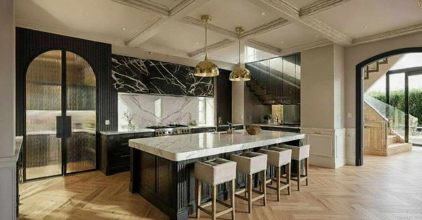 can you add architectural focal points and layered textures remove the ceiling molidng add crown molding in thin fluted white marble