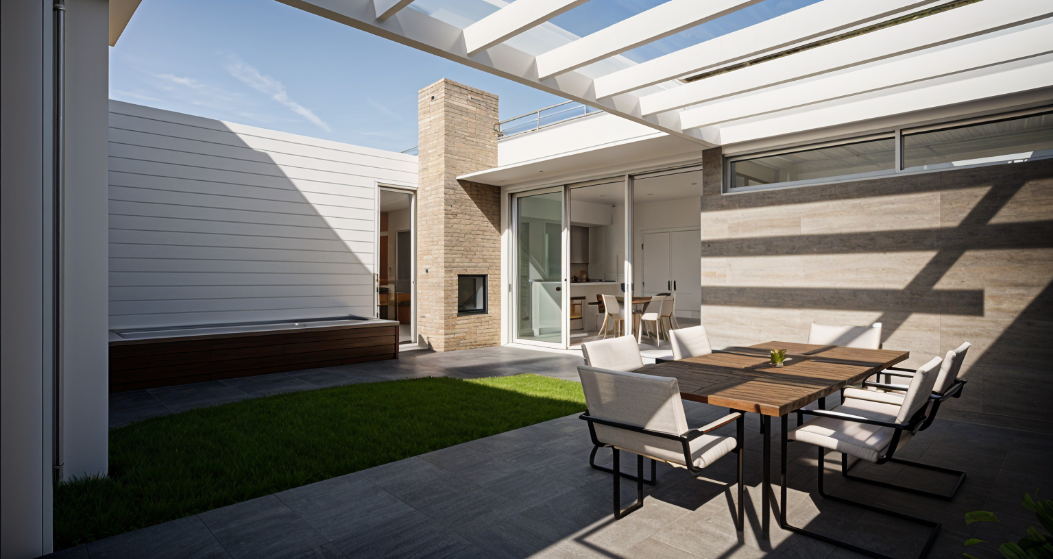 midday sun micro cement feature wall exposed aggregate external paving add large tree in courtyard add cushions back bench increase light within courtyard add dog on grass