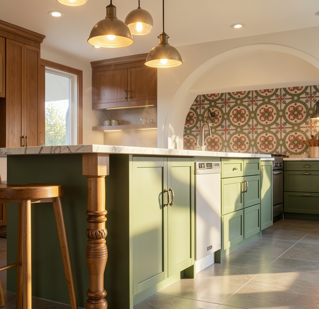 small black and white vintage floor tile vintage green walls brass sink faucets and mirrors vintage lighting