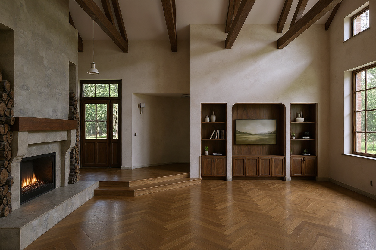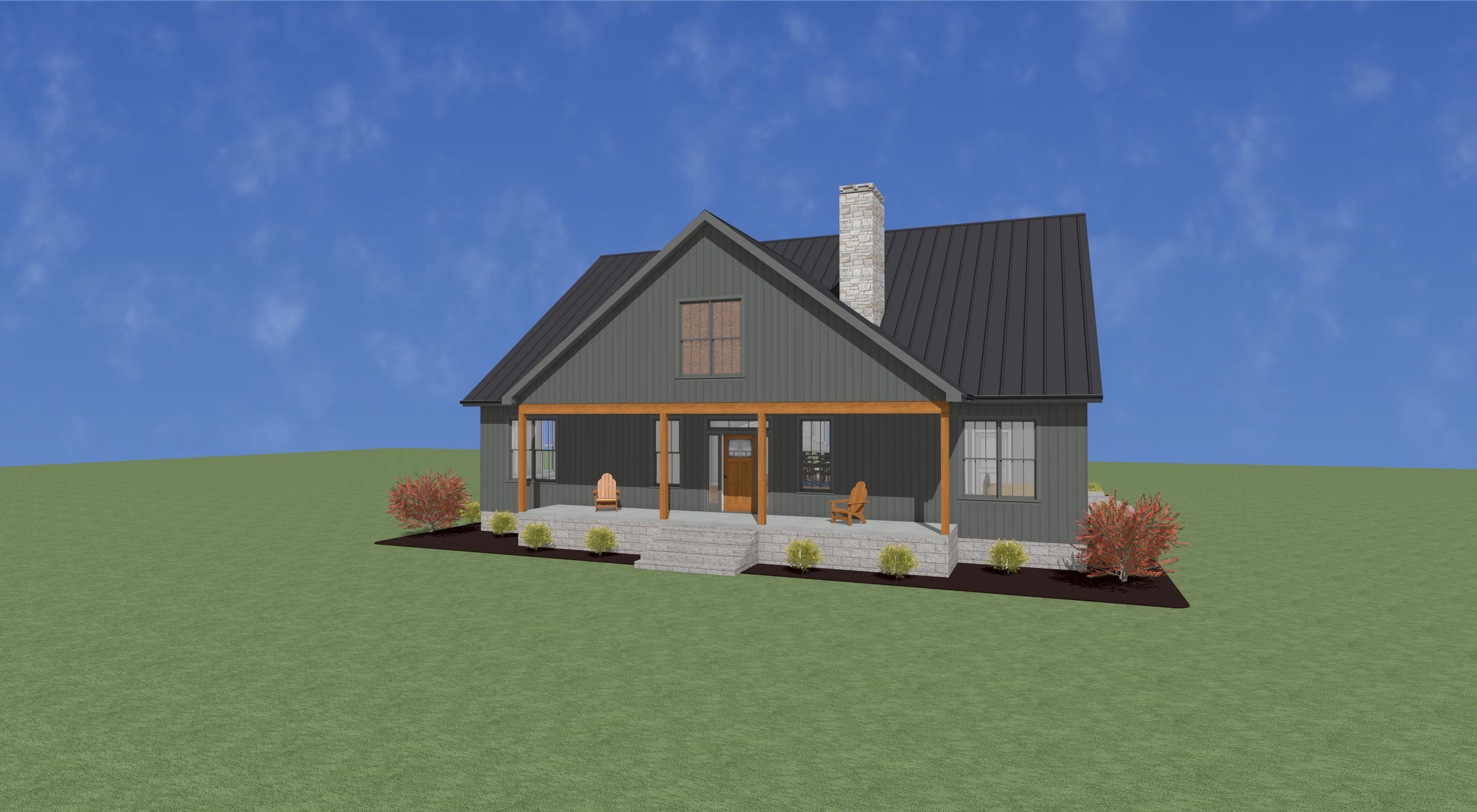 a picturesque farmhouse amidst vast greenery featuring a charming dark gray exterior with contrasting warm wood accents the roof is a sleek deep charcoal while natural stone elements on the chimney add rustic charm the front porch is accented by inviting light wooden chairs surround the house with landscaped greenery including vibrant red shrubs and pastel yellow green bushes under a sky of gentle blue with soft clouds create a serene peaceful atmosphere ideal for a countryside retreat add snow and christmas lights