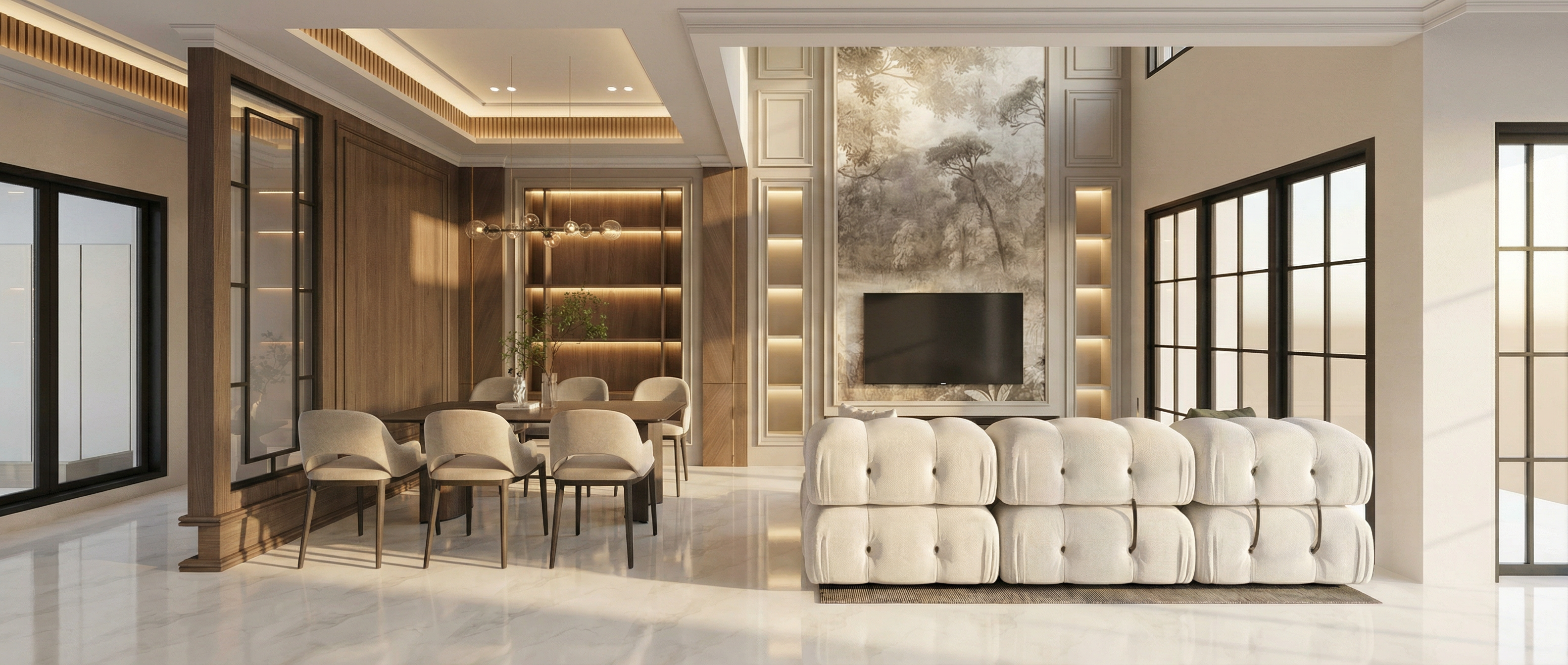 make ultra realistic image without changing any structures shapes design and materials do not change the jpeg size use soft glossy white marble texture for the floor add indirect light to every shelves use the materials as shown in the picture use white glossy marble texture for dining top table add bevel bronze mirror to dining wall panel