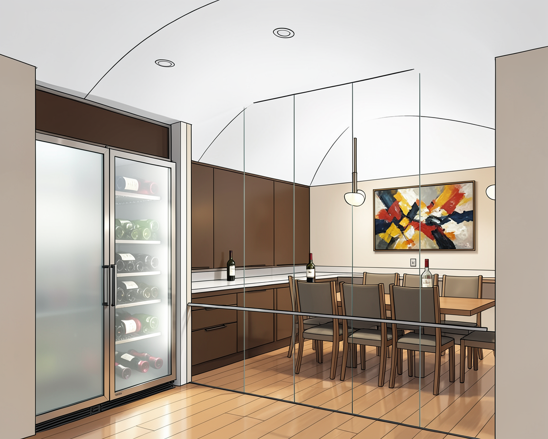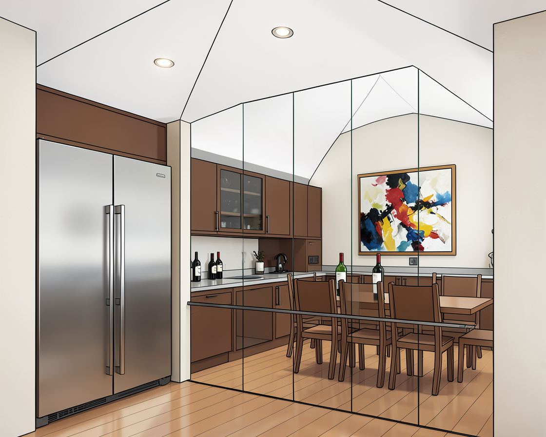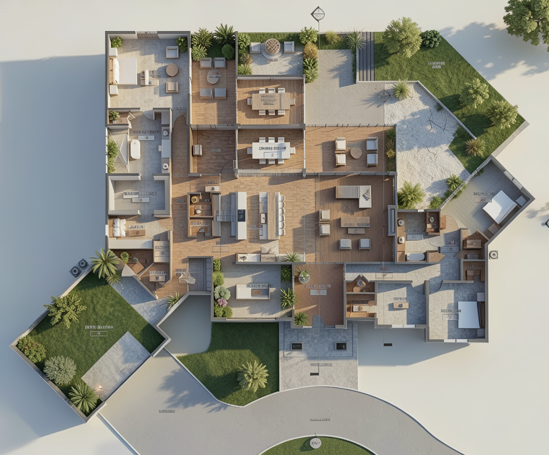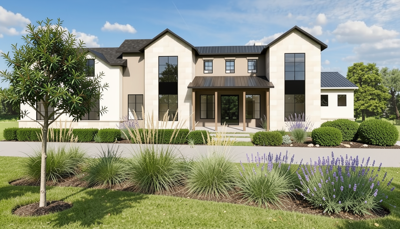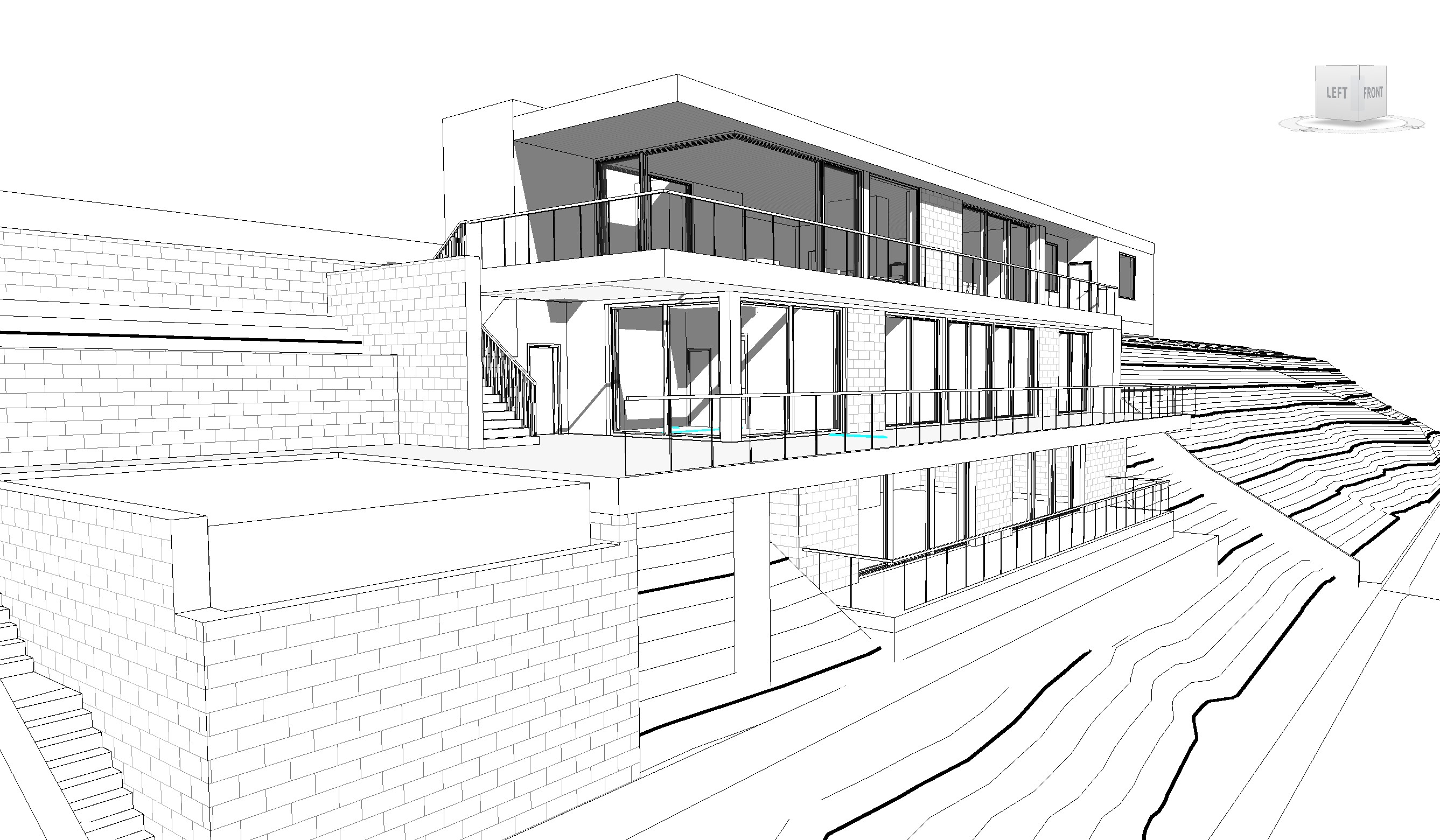 a modern house in pacific palisades ca overlooking the pacific ocean with smooth white plaster finish wood ceiling and deck finish brushed aluminum sliding glass door frames and smooth travertine stone accents with frameless glass railings view on a hill with lush green grass and olive trees and california native bushes and modern houses surrounding the building california summer weather