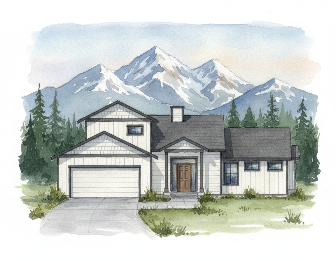 watercolor render of modern craftsman style home grey paint white trim and stone accents include trees and an alaska like environment in the background simple driveway and walkways in front of the home