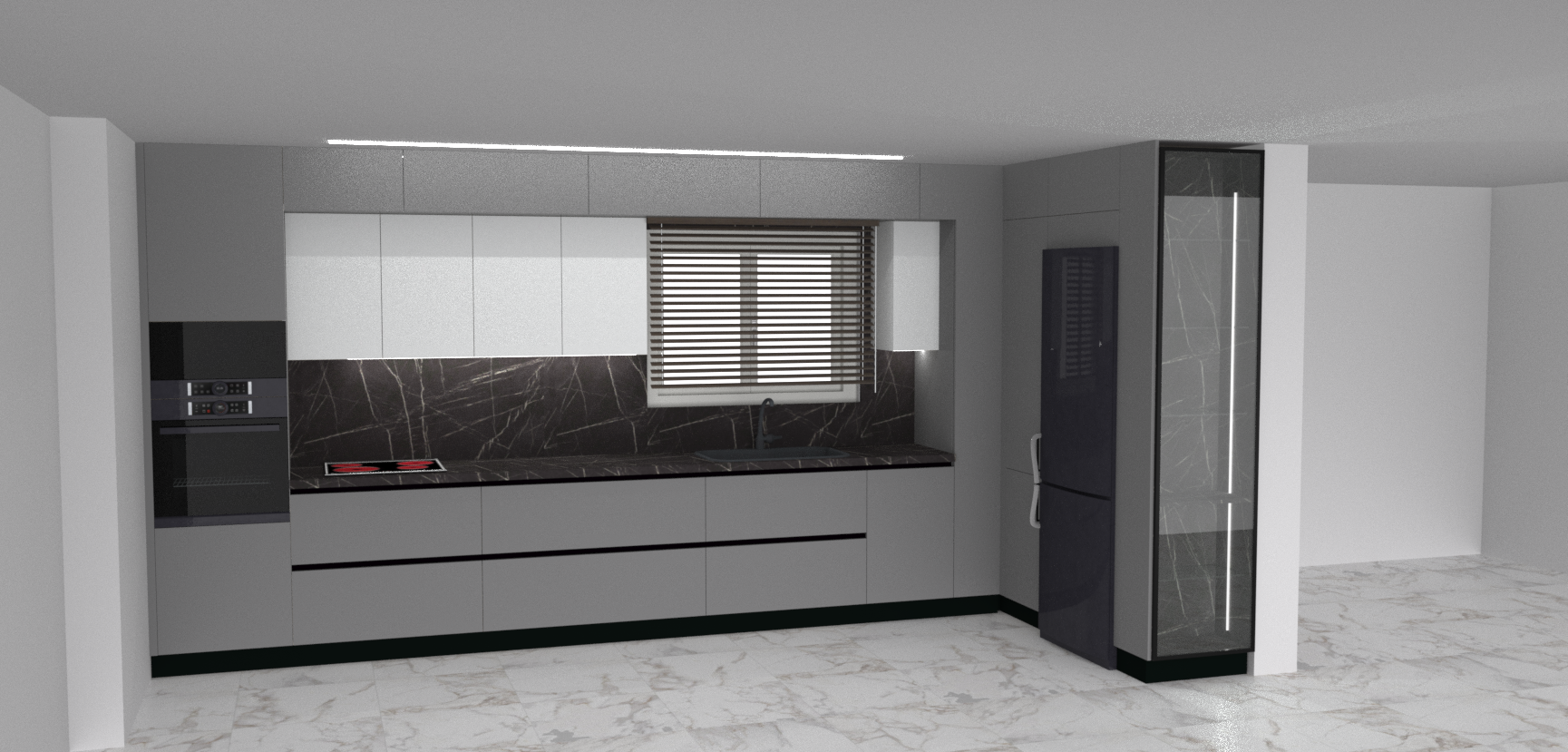 render a modern kitchen with sleek minimalist design the cabinets are matte beige providing a warm and welcoming feel the countertops are a rich dark wood adding a touch of elegance and depth the walls and ceiling are a soft white allowing the kitchen elements to stand out incorporate subtle lighting for a cozy and inviting atmosphere the floor is smooth with a pale gray finish enhancing the modern aesthetic