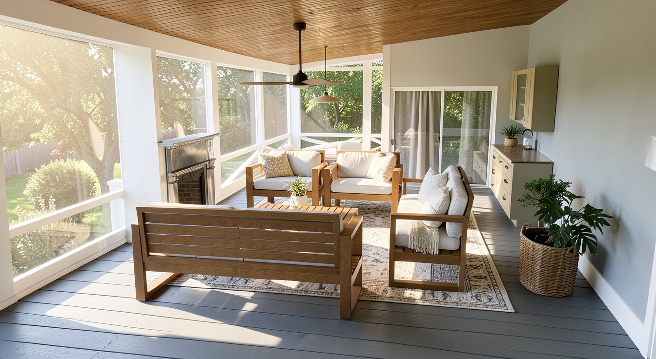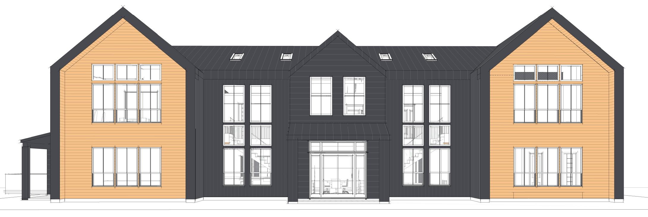 elevate this using peruvian teak composite wood iron ore painted board and batten norstone planc platinum stone and a black metal roof
