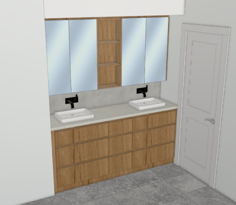add bathroom decor led lighting under mirror cabinet and downlights under the bulkhead have a lady standing in front of the vanity brushing their teeth