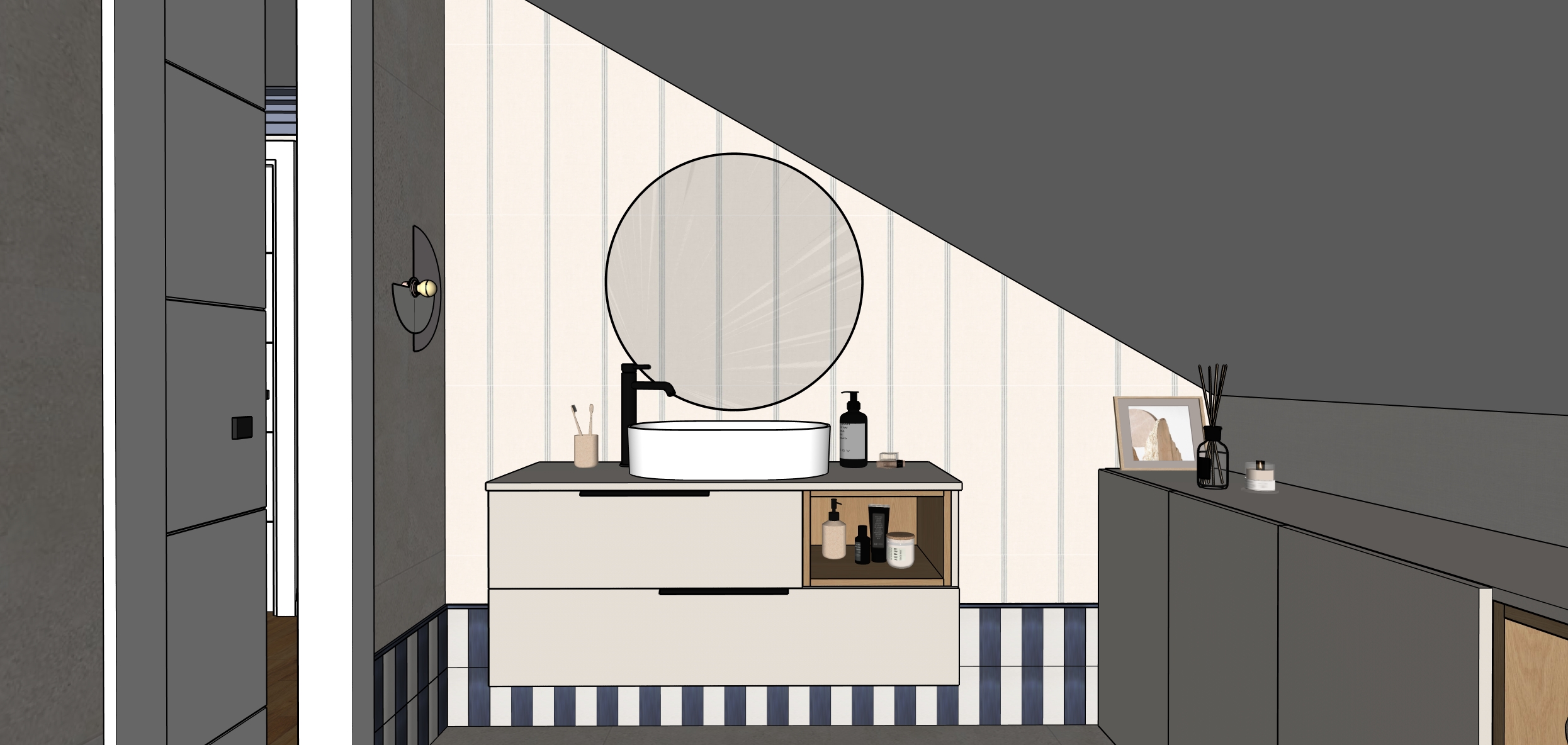 crea una imagen fotorealista a partir de este sketchup realza texturas e iluminacion aclara la imagen al ba o le entra mucha luz el espejo se ve raro corrigelo