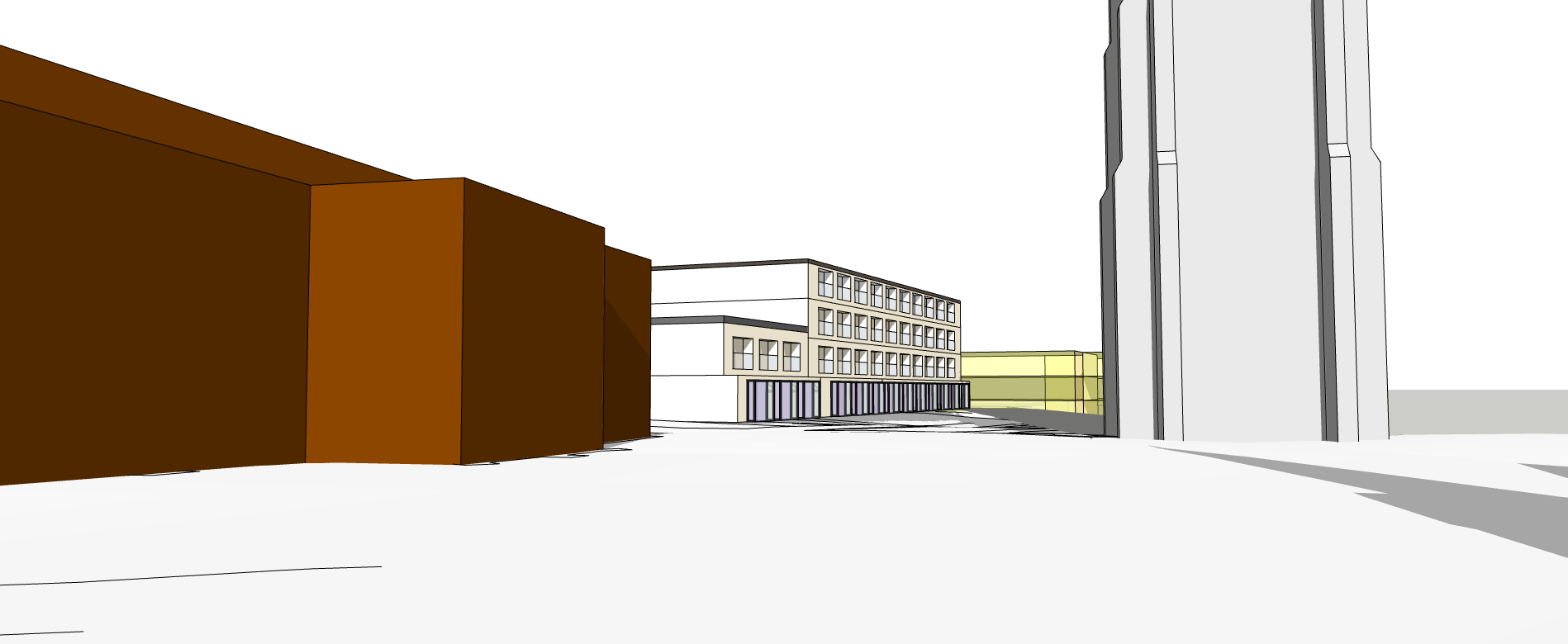 render a natural stone modern retail development with shop fronts looking out onto a manicured park with lawns landscaped borders the yellow building at the back should be a natural stone retail development matching the rest of the development the orange building to the left of the retail development is a beige stone 13th century gothic style church and the grey building at the right of the image is a beige stone 13th century gothic style bell tower
