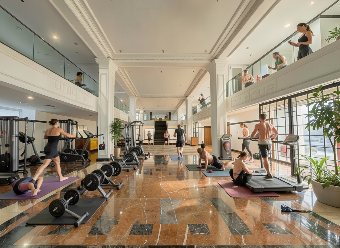 make a high end gym with different weight equipment people working out on yoga mats add a treadmill and peoplee on the balcony add more workout equipment