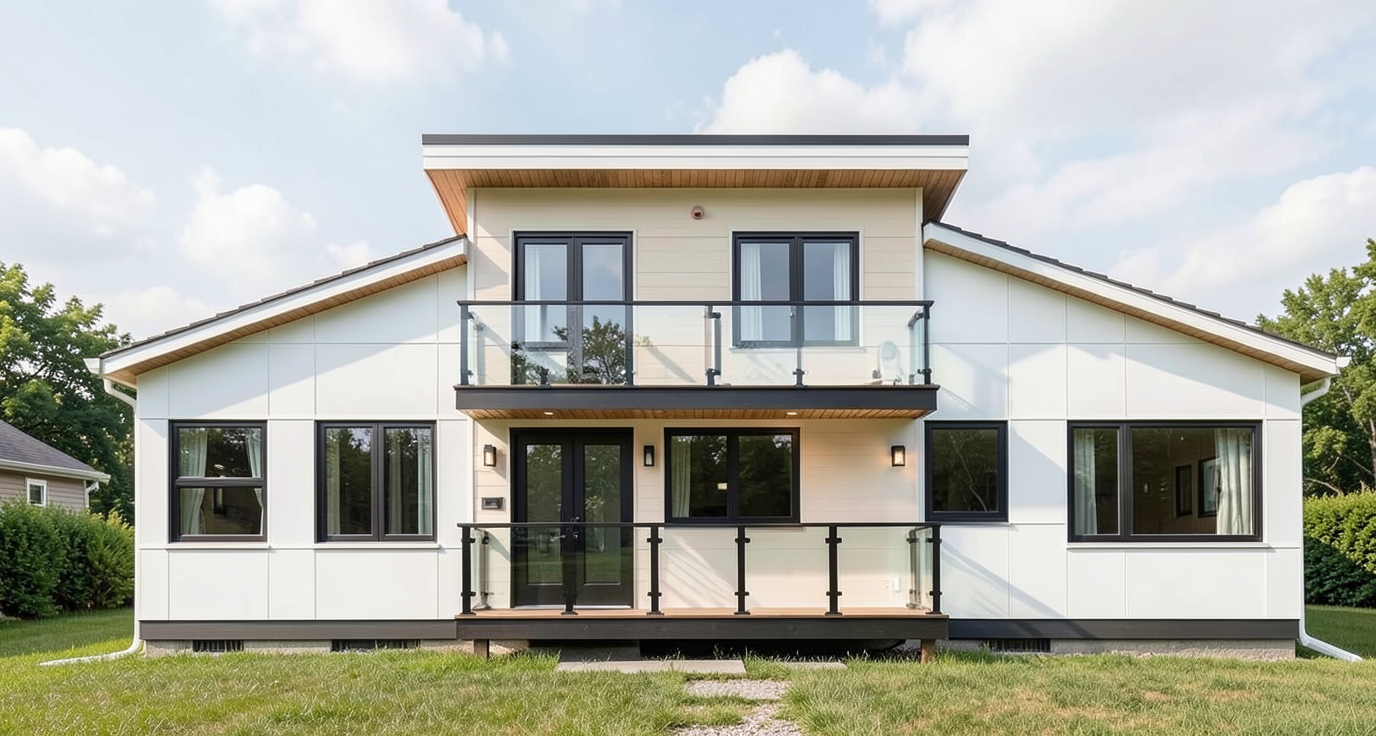 modern elevation in white smooth hardie panel lux westcoast series colour fawn on edge of windows and in centre soffit is wood black window frames
