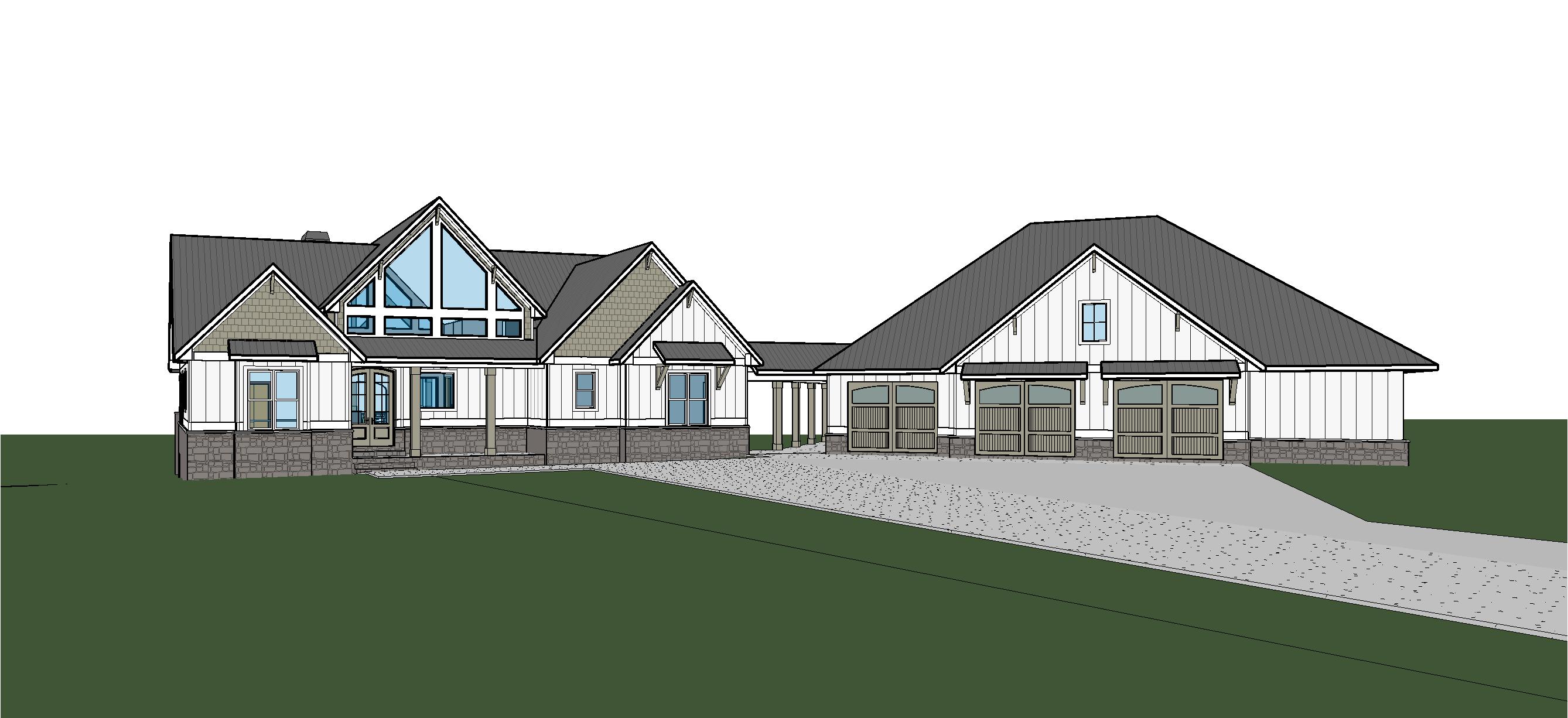 render a picturesque and elegant suburban house the main structure features a striking contrast between white siding and dark grey gable roof accentuate the triangular windows with a brilliant sky blue glass for added charm use warm earth tones for the brick foundation and stone details the large garage doors are to be a deep forest green adding a rustic touch incorporate lush vibrant green grass surrounding the house and a smooth light grey concrete driveway leading up to it set the scene in a crisp clear afternoon with soft ambient lighting to create an inviting and serene atmosphere architecture