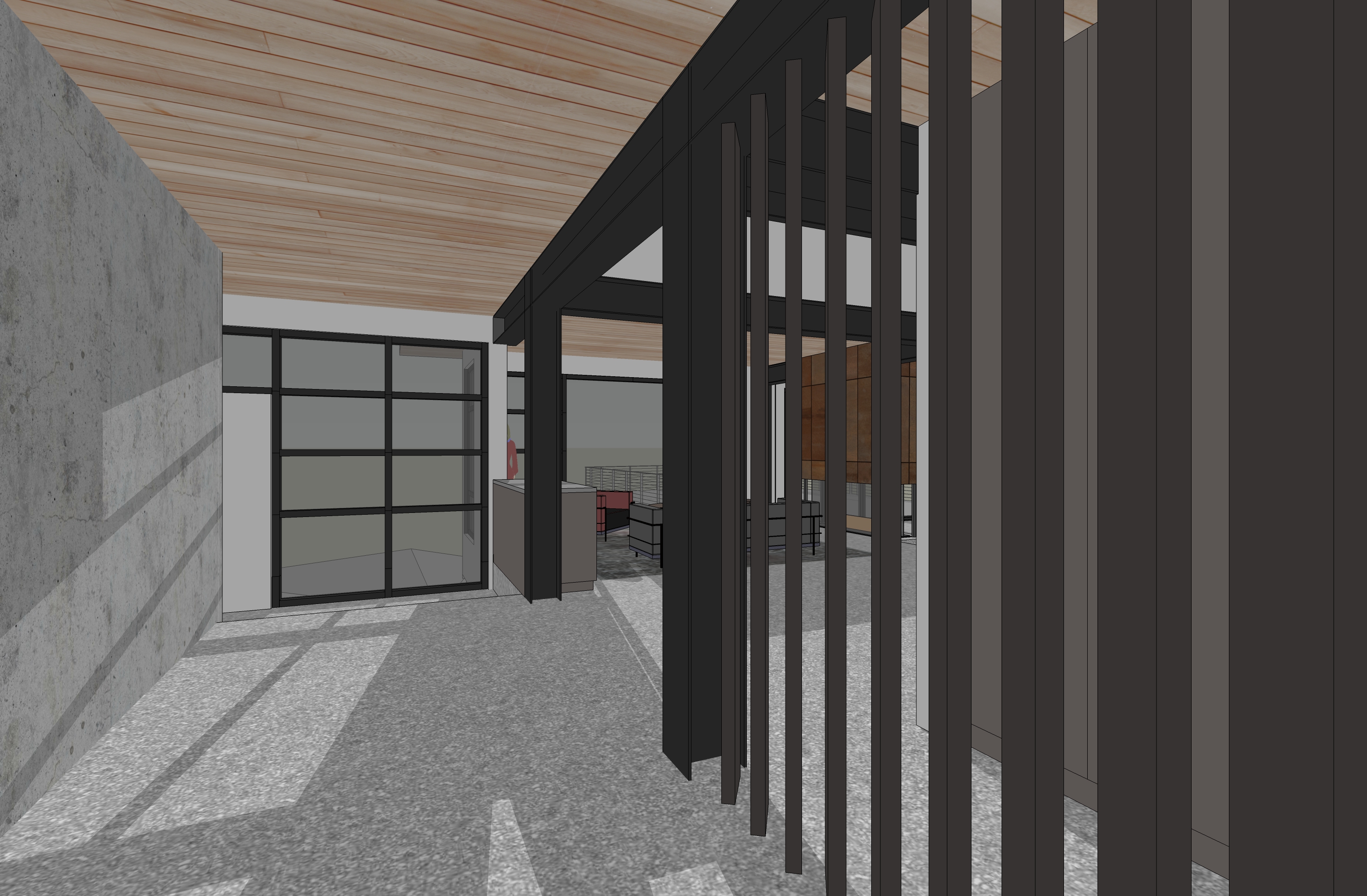 interior view matte concrete floors wood ceiling matte black steel framing weathered wood accent wall